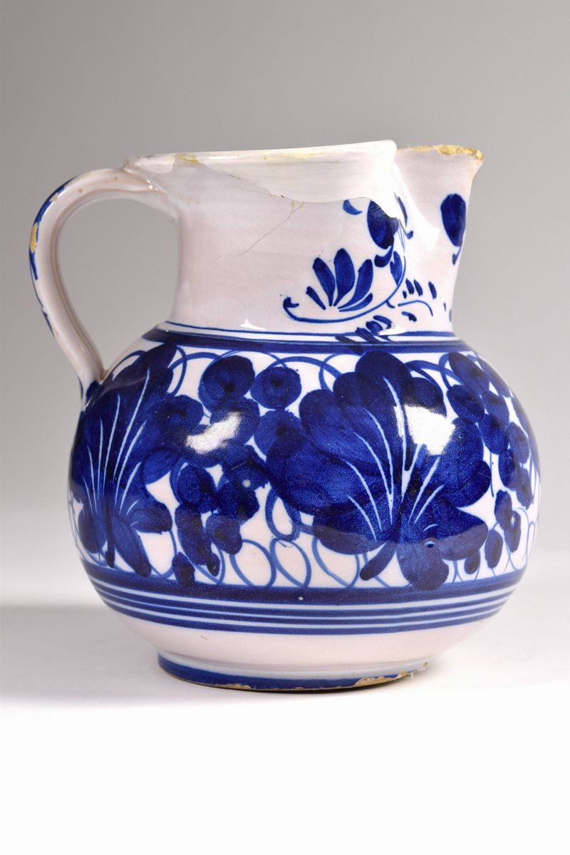 Boccale in maiolica policroma dipinto alla foglie di vite blu, bocca trilobata evidenziata da fiori.