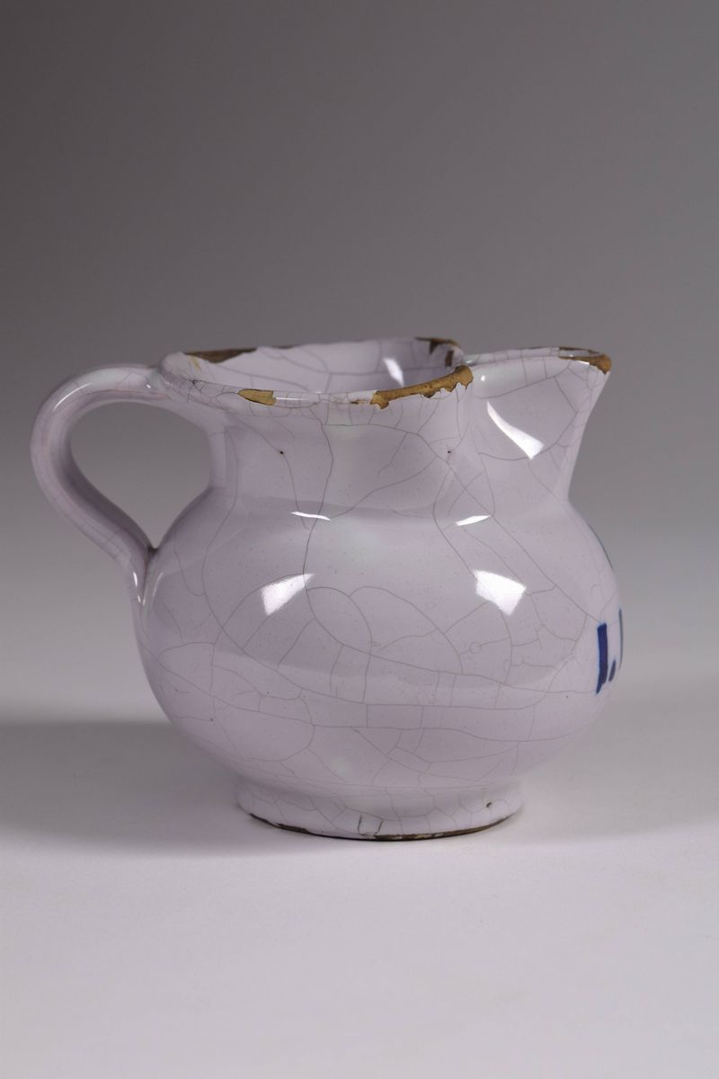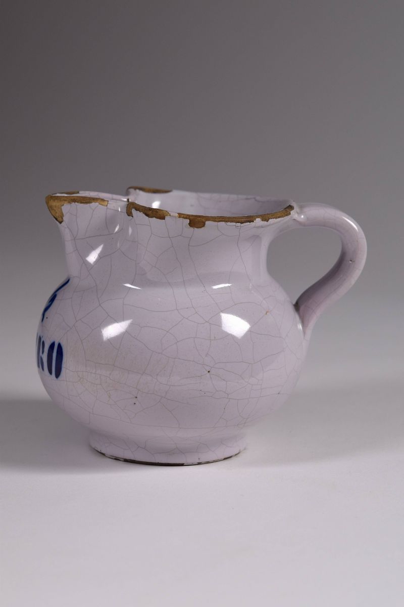Boccale in maiolica bianca a bocca trilobata, scritta 1/2 litro in blu, senza piombino.