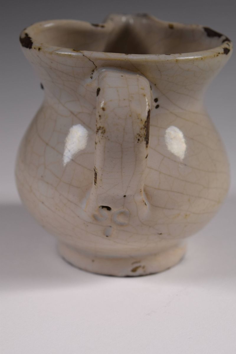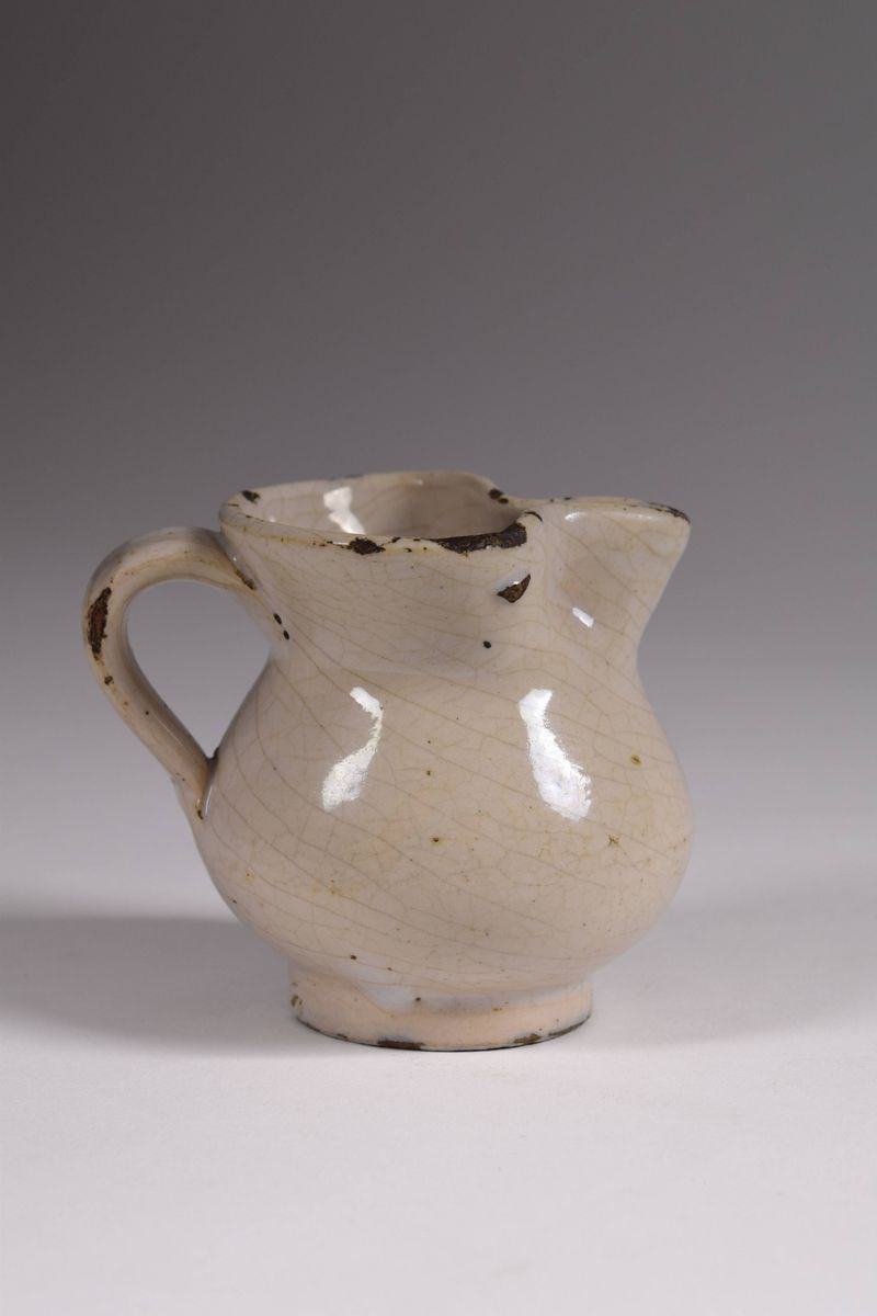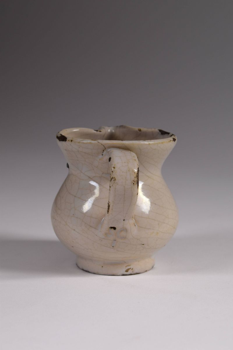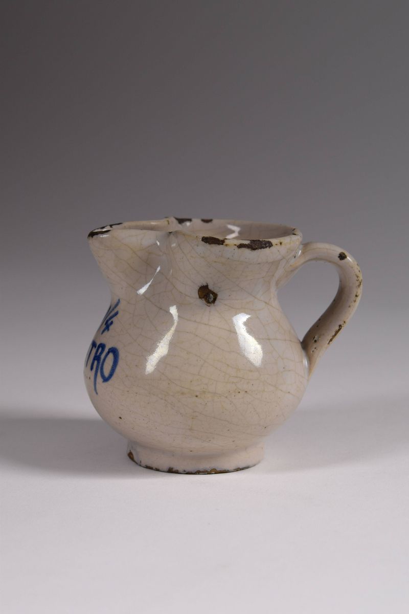 Boccale in maiolica bianca a bocca trilobata con scritta "1/4 litro" in blu, all'interno piombo annonario (bollo fiscale).