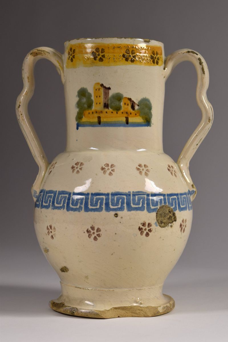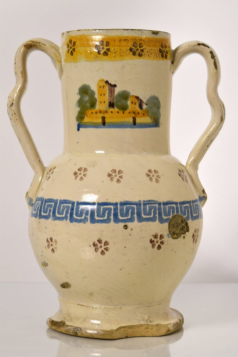 Brocca a due manici in maiolica policroma con bocca evidenziata da motivi a "spugna" in bruno a sfondo giallo ocra, nel fronte e nel retro dipinto un castello, mentre nella parte mediana è decorata a "spugna" nei colori del bruno e greca in blu.