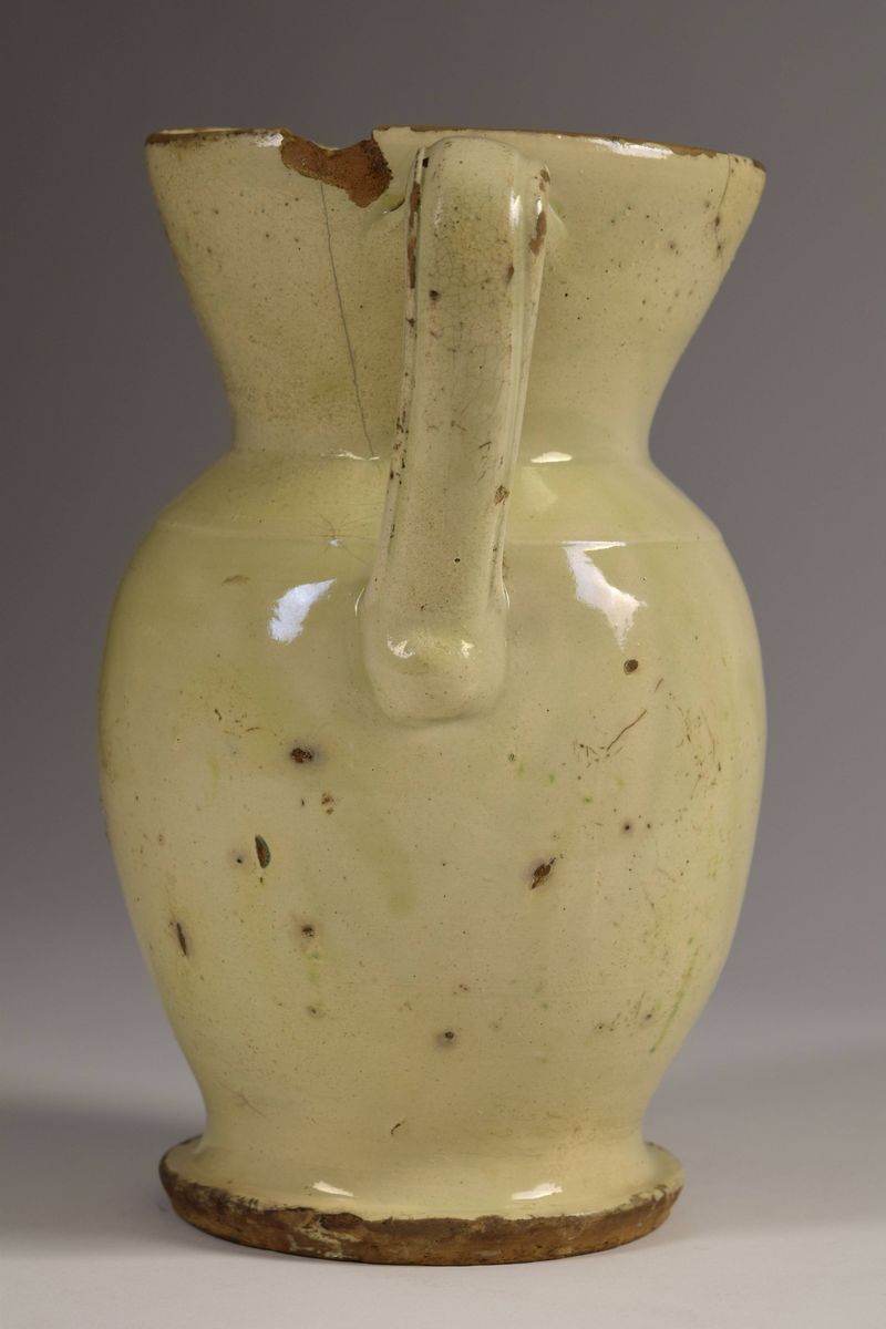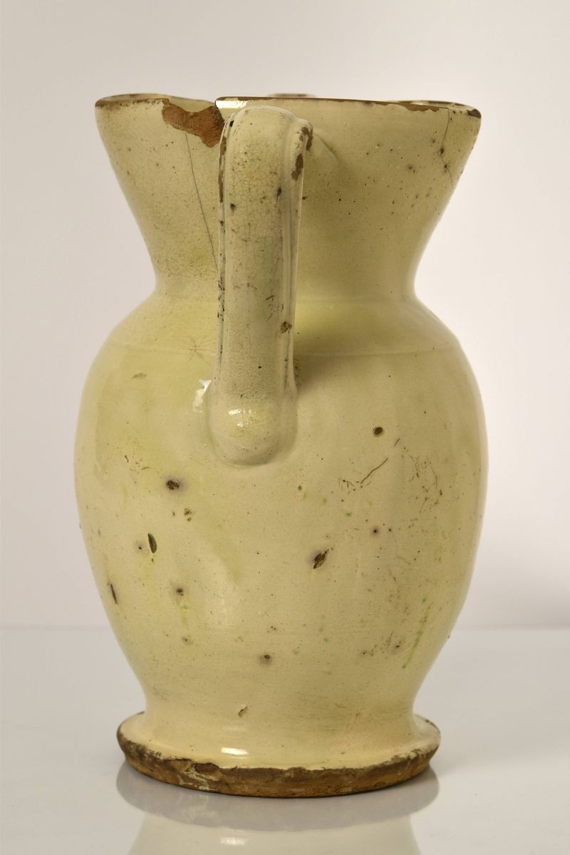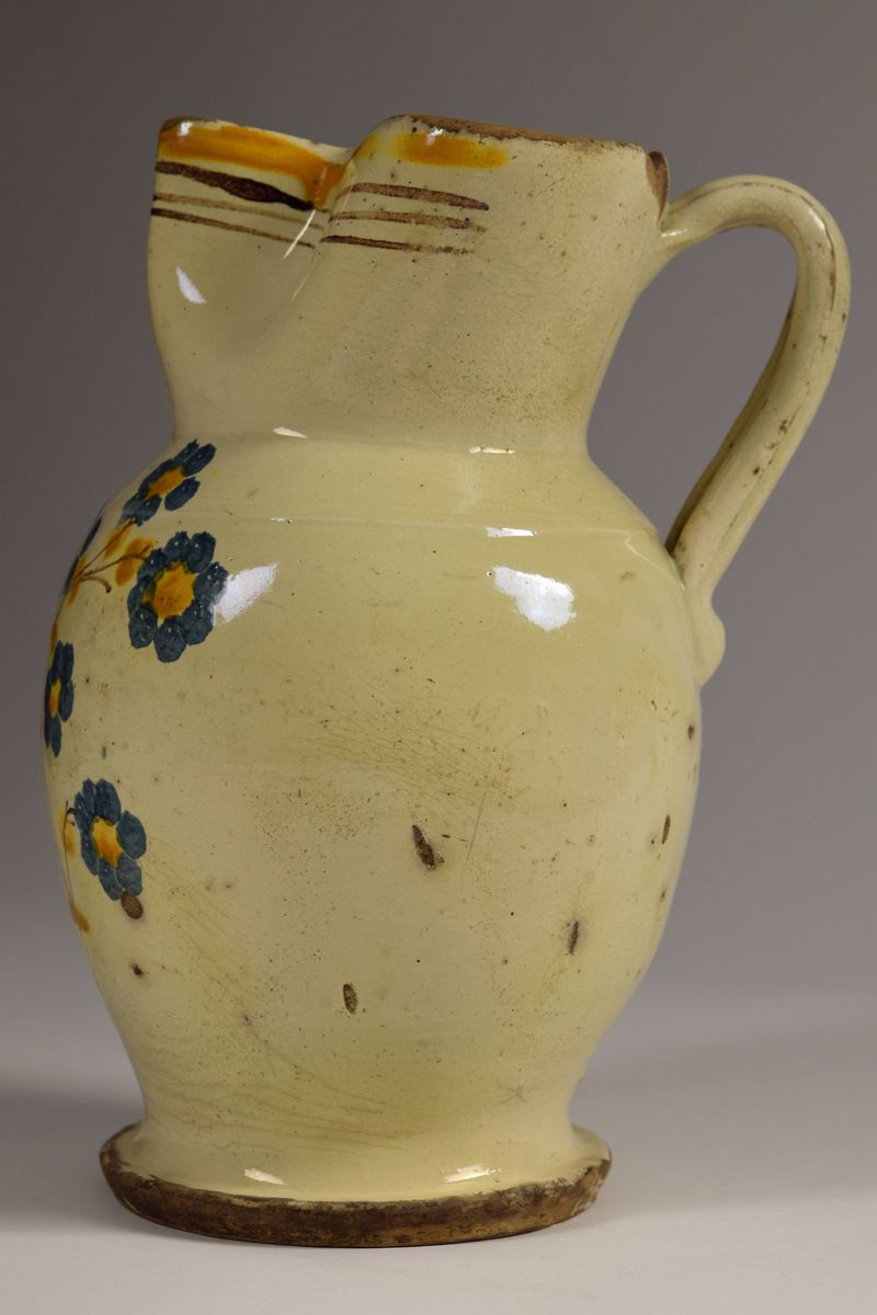 Brocca in maiolica policroma a bocca trilobata evidenziata da righe in bruno e giallo ocra, nella parte mediana è dipinto un ramo fiorito nei colori del bruno, blu e giallo ocra.