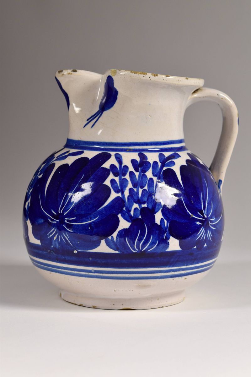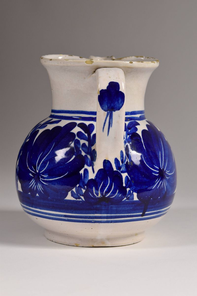 Brocca in maiolica policroma dipinta a bocca trilobata evidenziata da fiori, corpo decorato da motivi floreali blu.