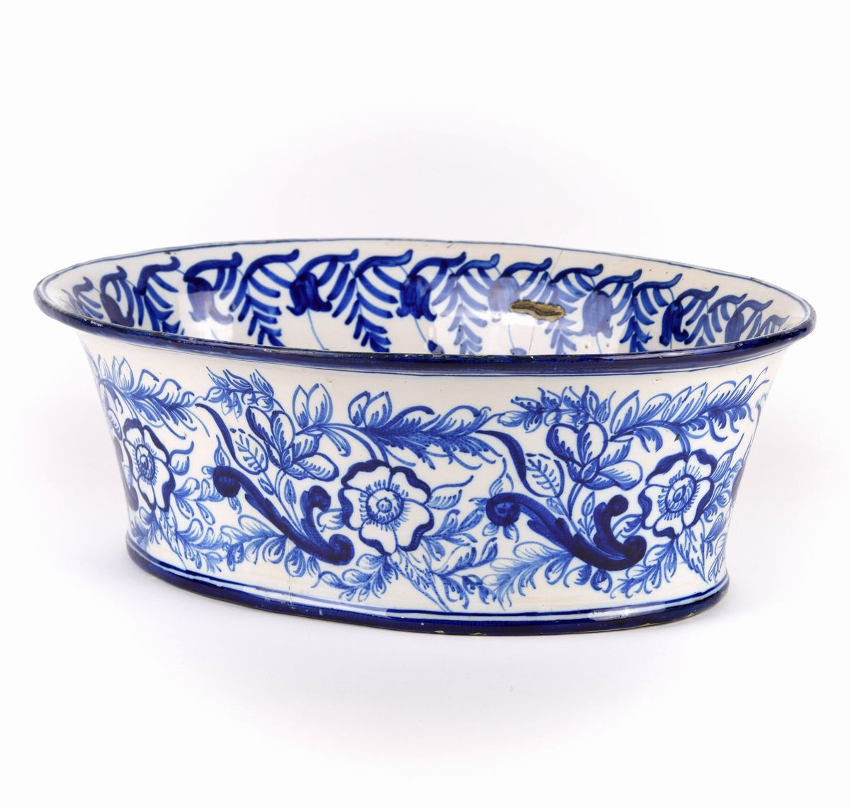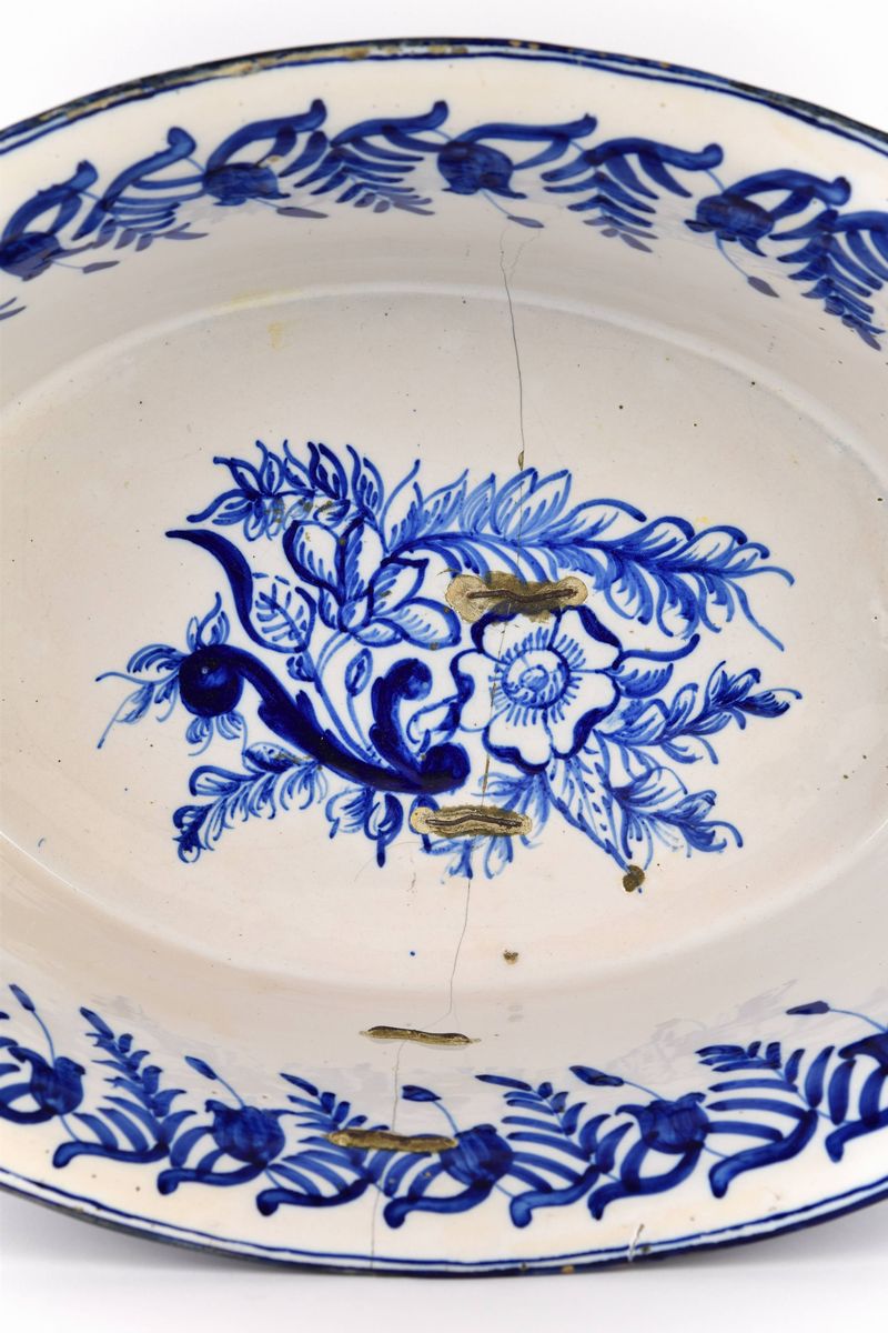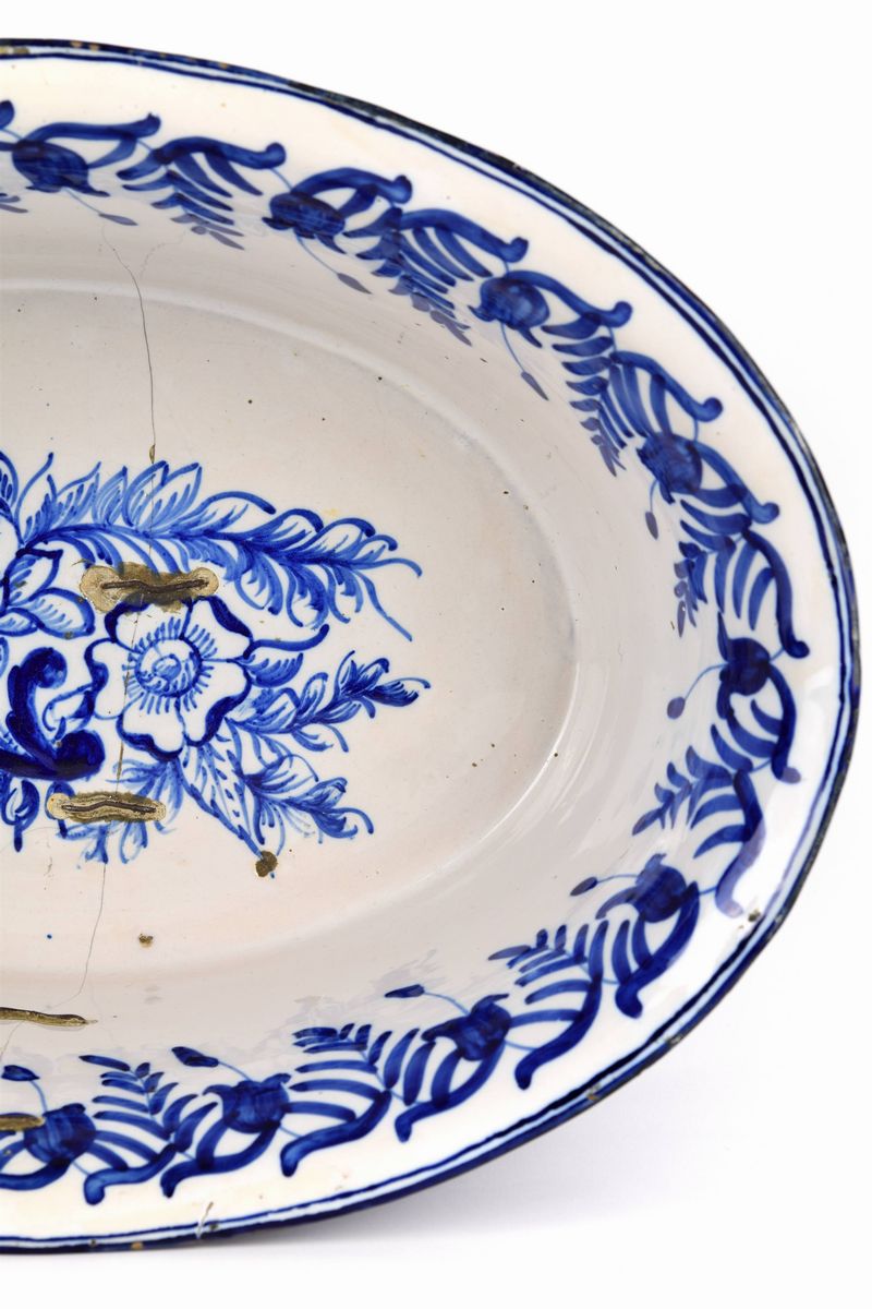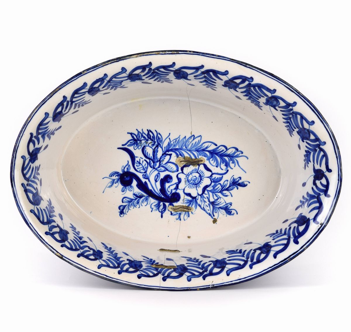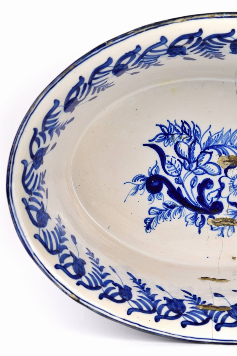 Grande centrotavola in maiolica policroma dipinto interamente a motivi floreali nei toni del colore blu.