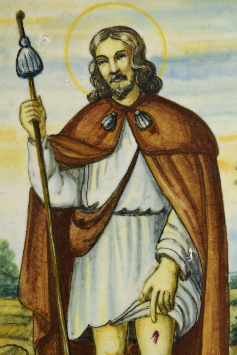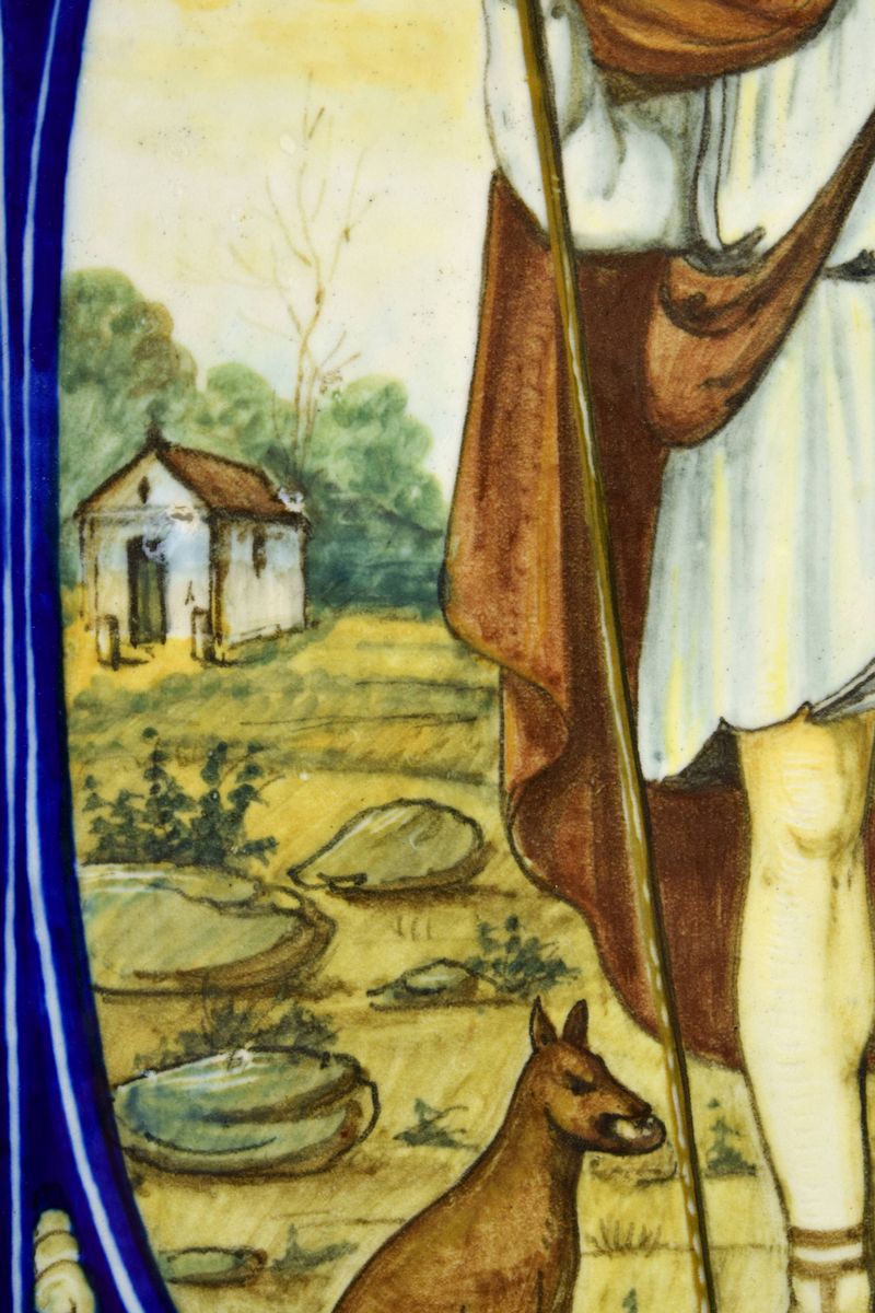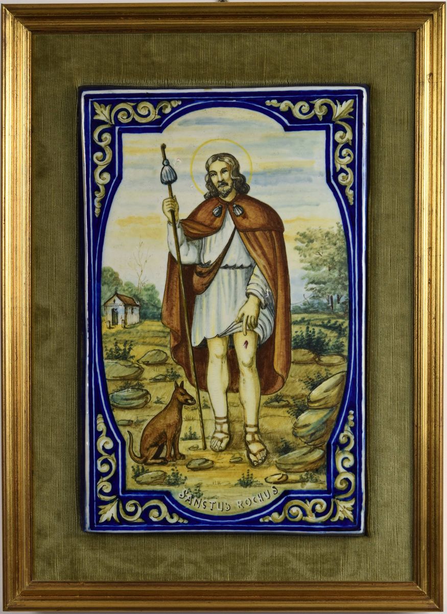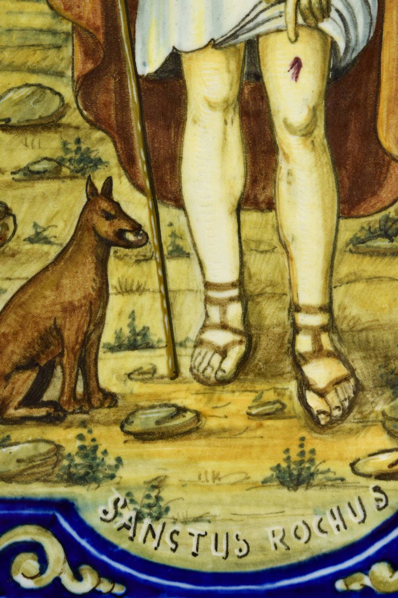 Piastra devozionale in ceramica dipinta a mano raffigurante San Rocco nella classica iconografia con a lato del Santo un cane che reca in bocca un pezzo di pane sottratto alla mensa del nobile Gottardo, serviva a nutrire il Santo durante la malattia.