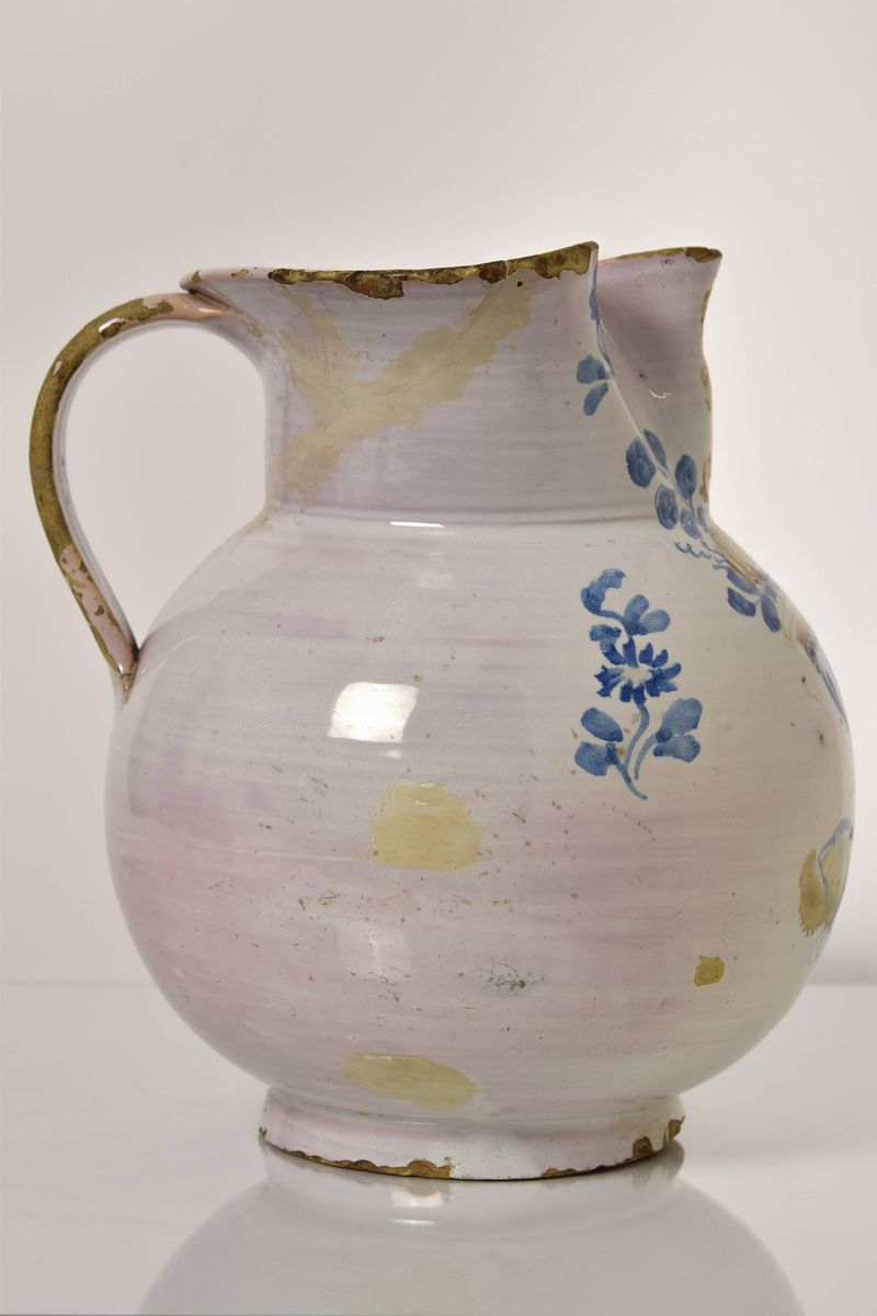 Grande brocca in maiolica policroma a bocca trilobata decorata con vaso con piedistallo e composizione floreale nei colori del blu, giallo e bruno.