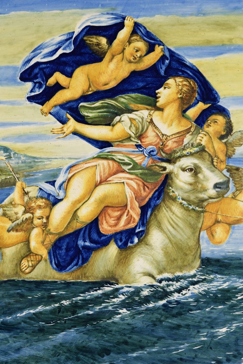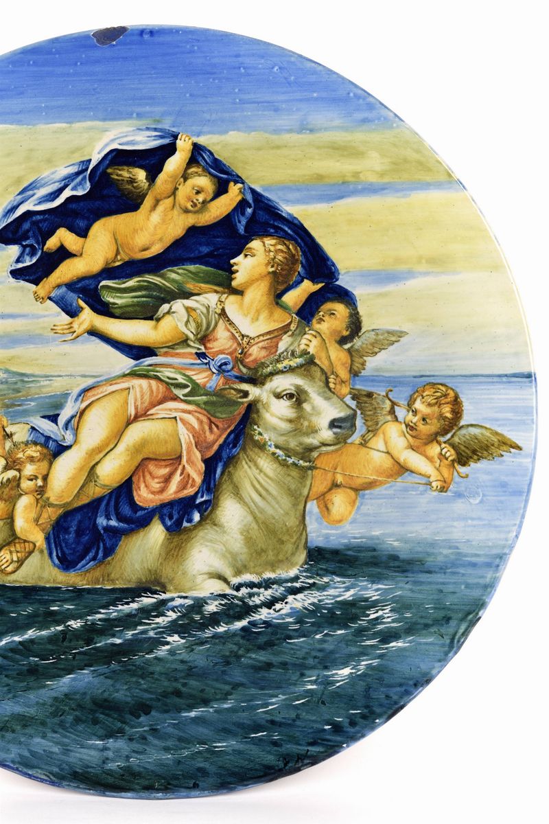 Grande piatto in maiolica policroma dipinta raffigurante il "Ratto d'Europa".