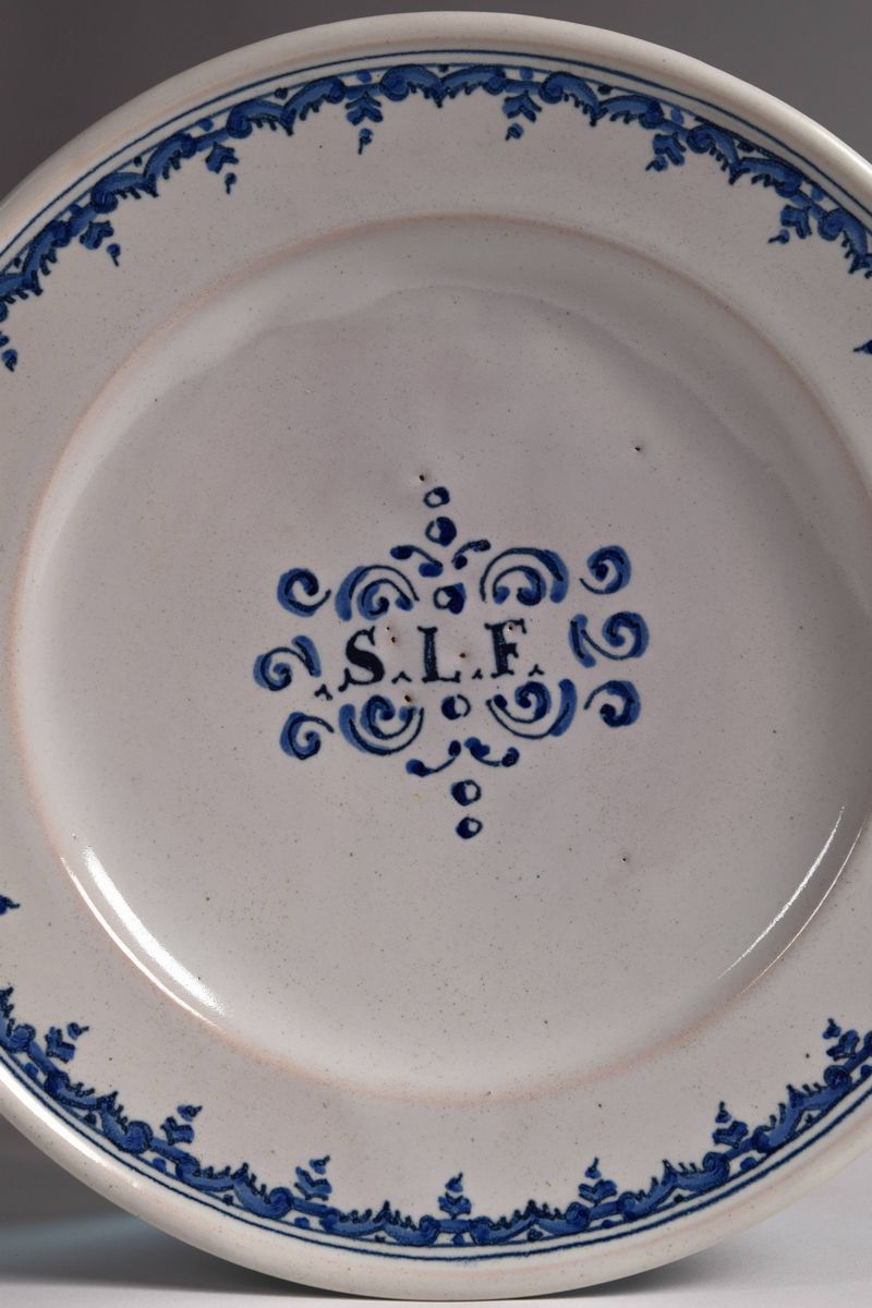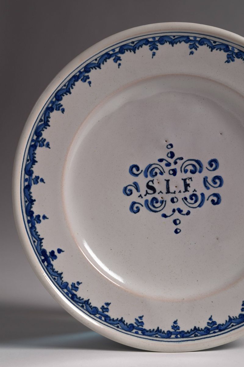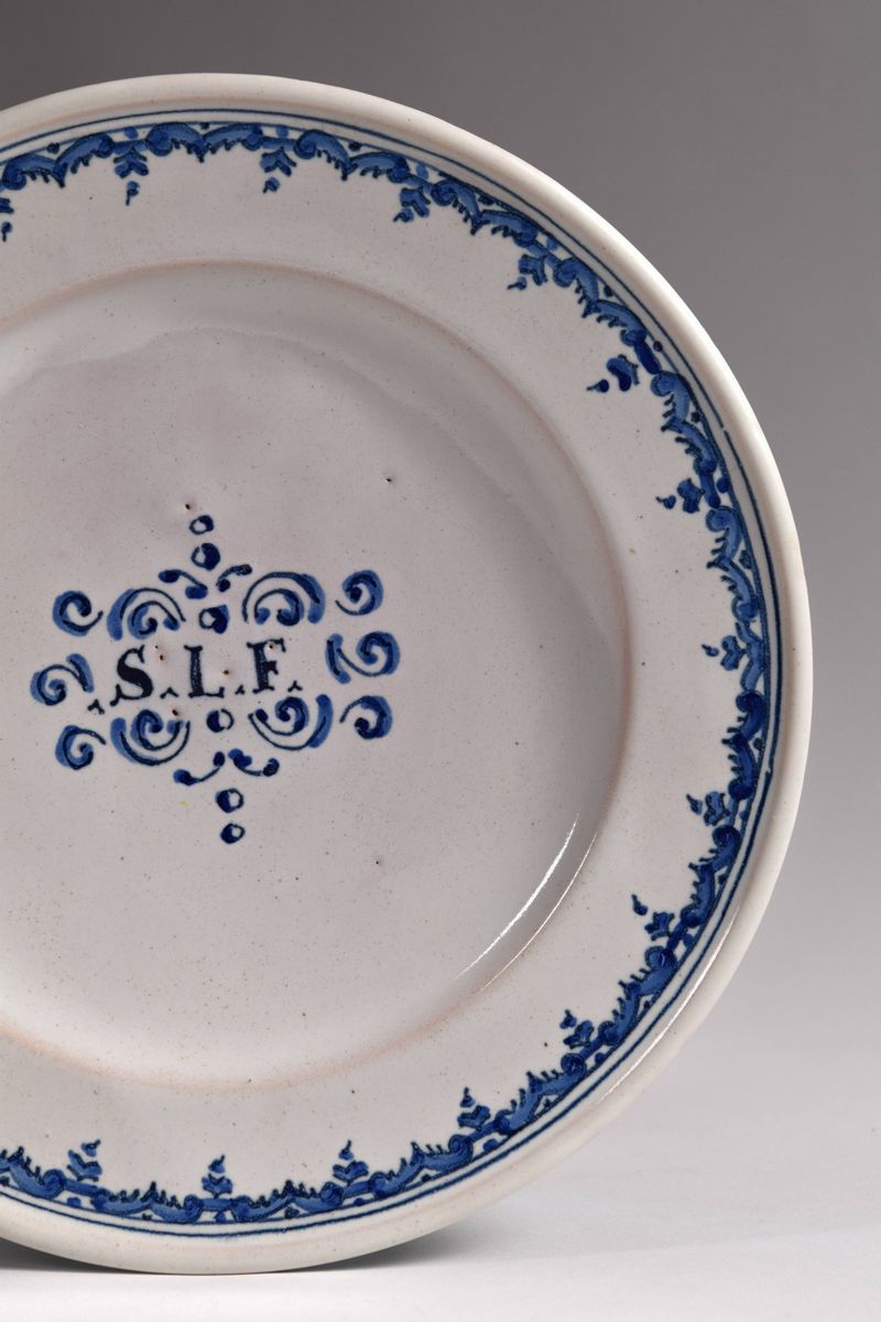 Piatto tondo in maiolica policroma nei colori del blu con al centro iniziali "S.L.F." entro cartiglio, tesa dipinta a "peducci".