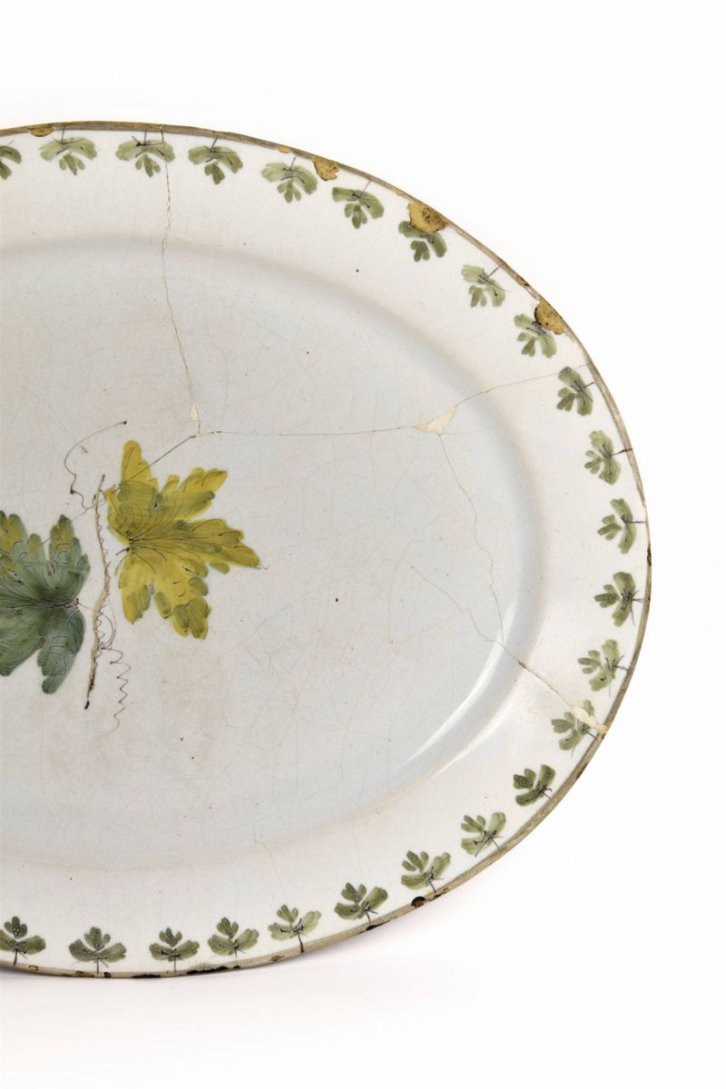 Piatto ovale in maiolica dipinta con vite al centro e piccole foglie lungo i bordi.