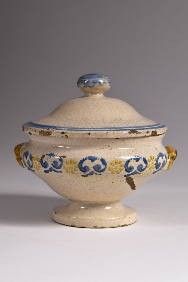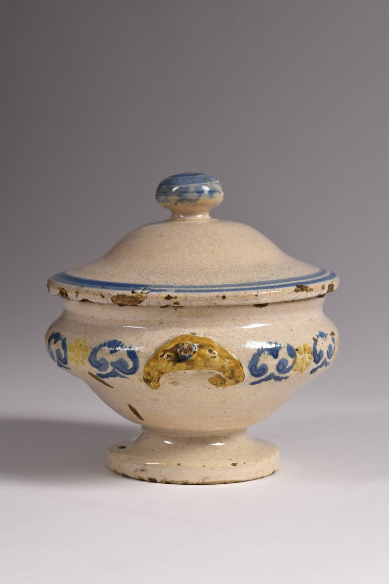 Piccola zuppiera in maiolica dipinta nel corpo a motivi a "spugna" azzurri e giallo ocra. Il bordo del coperchio è evidenziato da due righe azzurre, così come l'azzurro mette in evidenza il grande pomello. Manici ad altorilievo di color giallo ocra.
