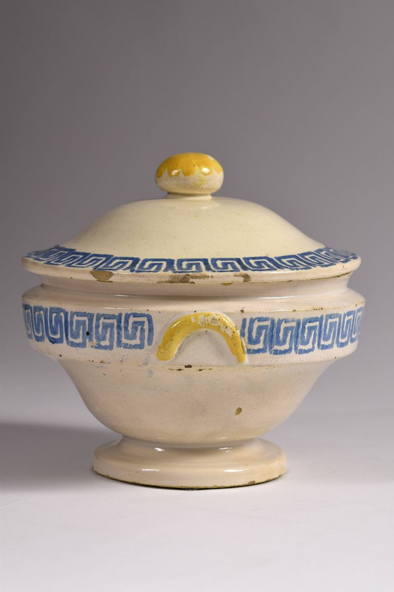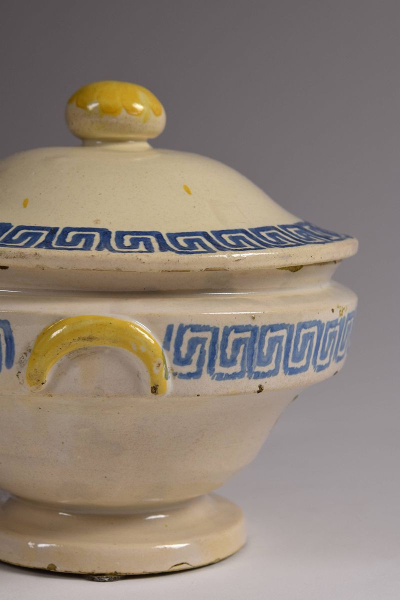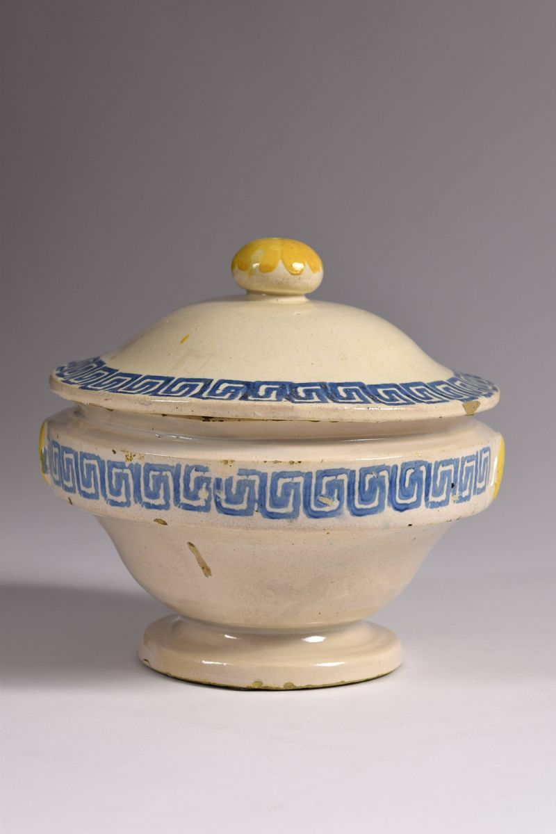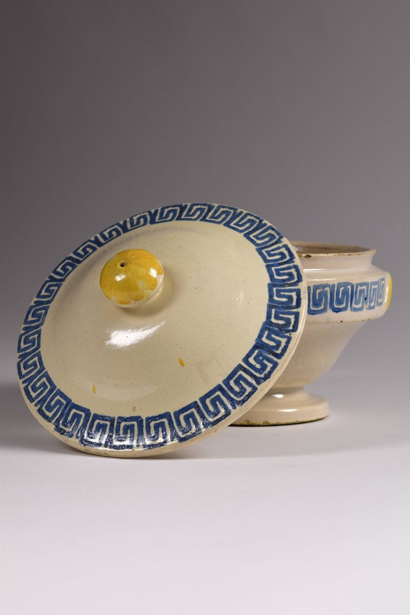 Zuppiera in maiolica dipinta a greche azzurre nel coperchio e nel corpo, pomello e manici evidenziati dal colore giallo ocra.