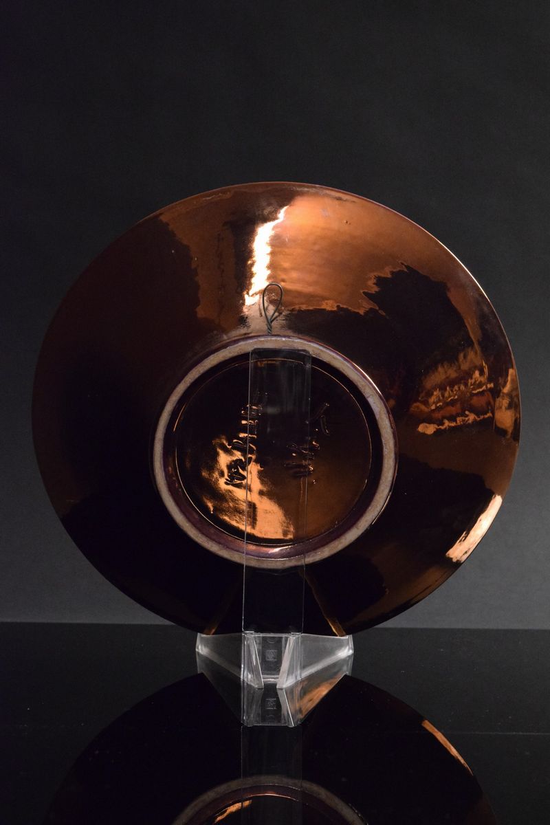 Grande ciotola in ceramica policroma a fondo chiaro con motivi informali riflessati color rame, retro a lustro color rame.