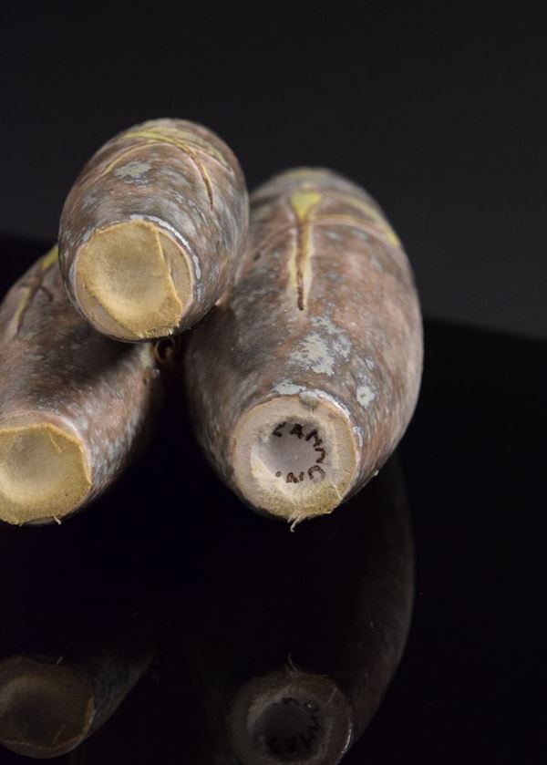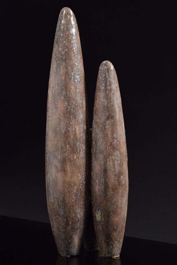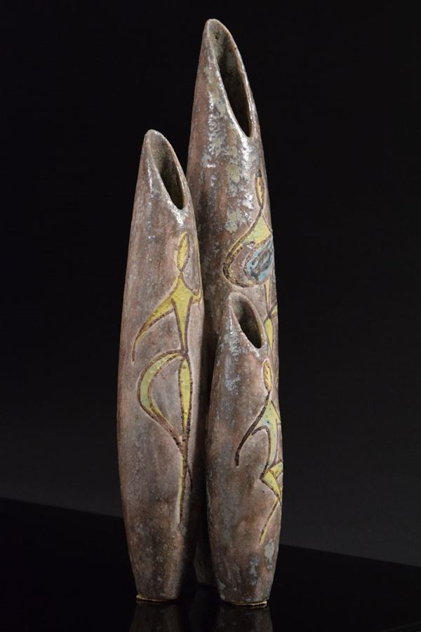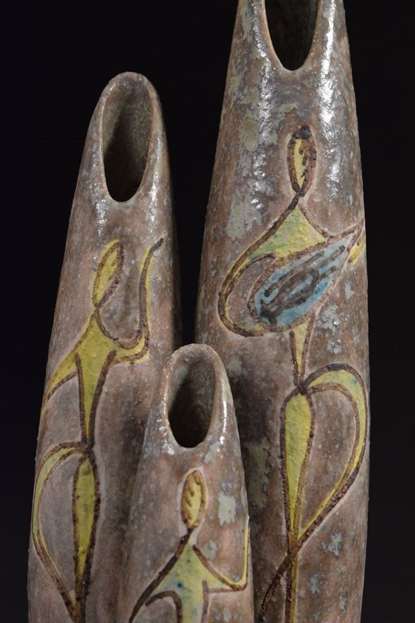 Vaso in ceramica policroma a tre bocche composto da tre elementi con figure stilizzate.