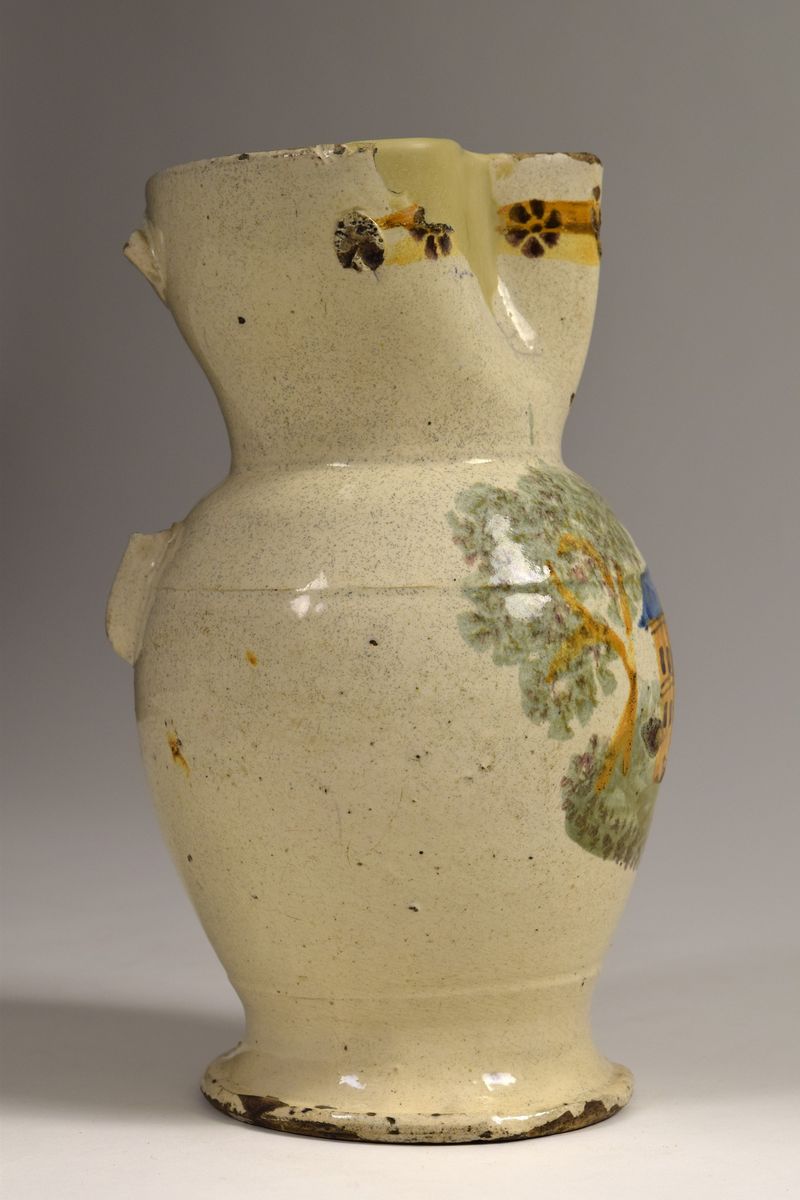 Brocca in maiolica policroma a bocca trilobata evidenziata da fiori a "spugna" bruni su righe ocra. Corpo decorato con case tra alberi.