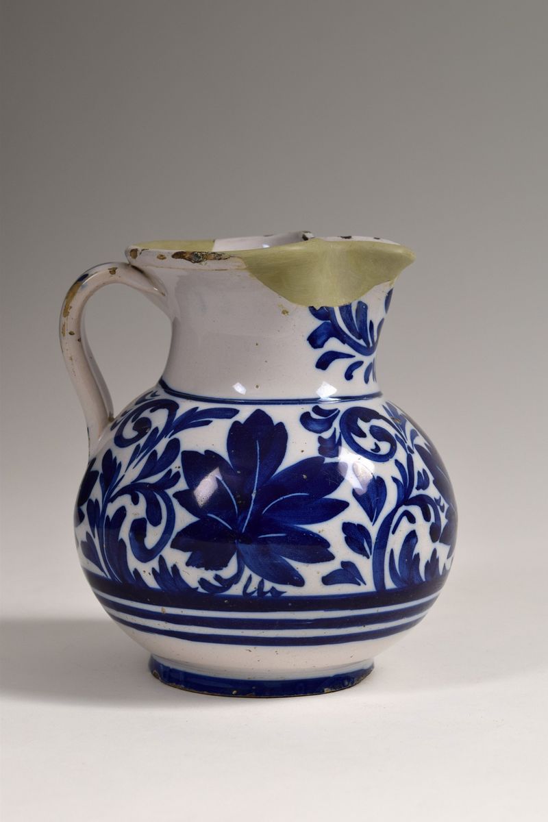 Brocca in maiolica policroma decorata a foglia di vite ed eleganti tralci di foglie, bocca trilobata e manico evidenziati da decori a fogliame in blu.