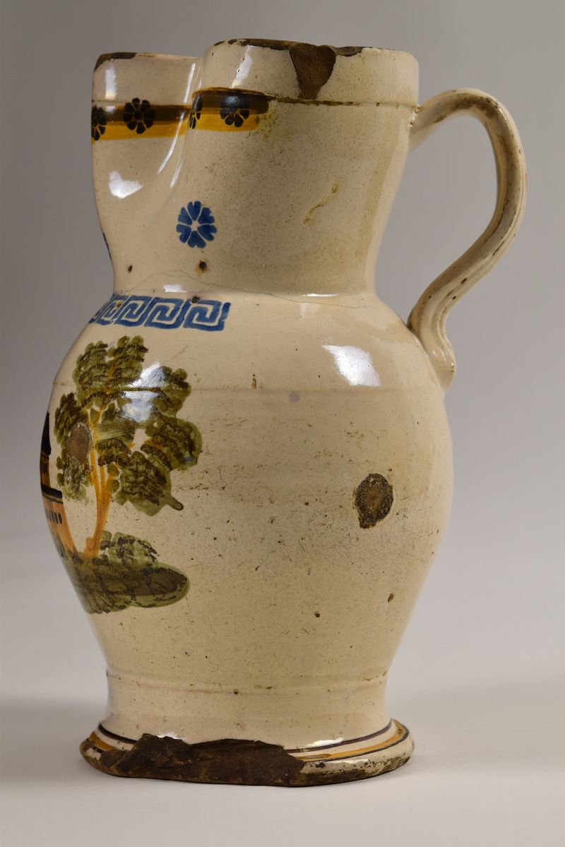 Brocca in ceramica policroma a bocca trilobata evidenziata da fiori a spugna e riga, corpo dipinto da greca e grande convento con alberi al centro.
