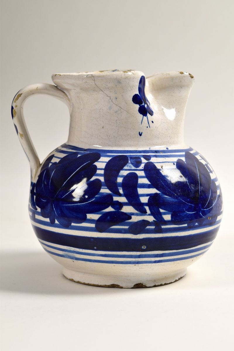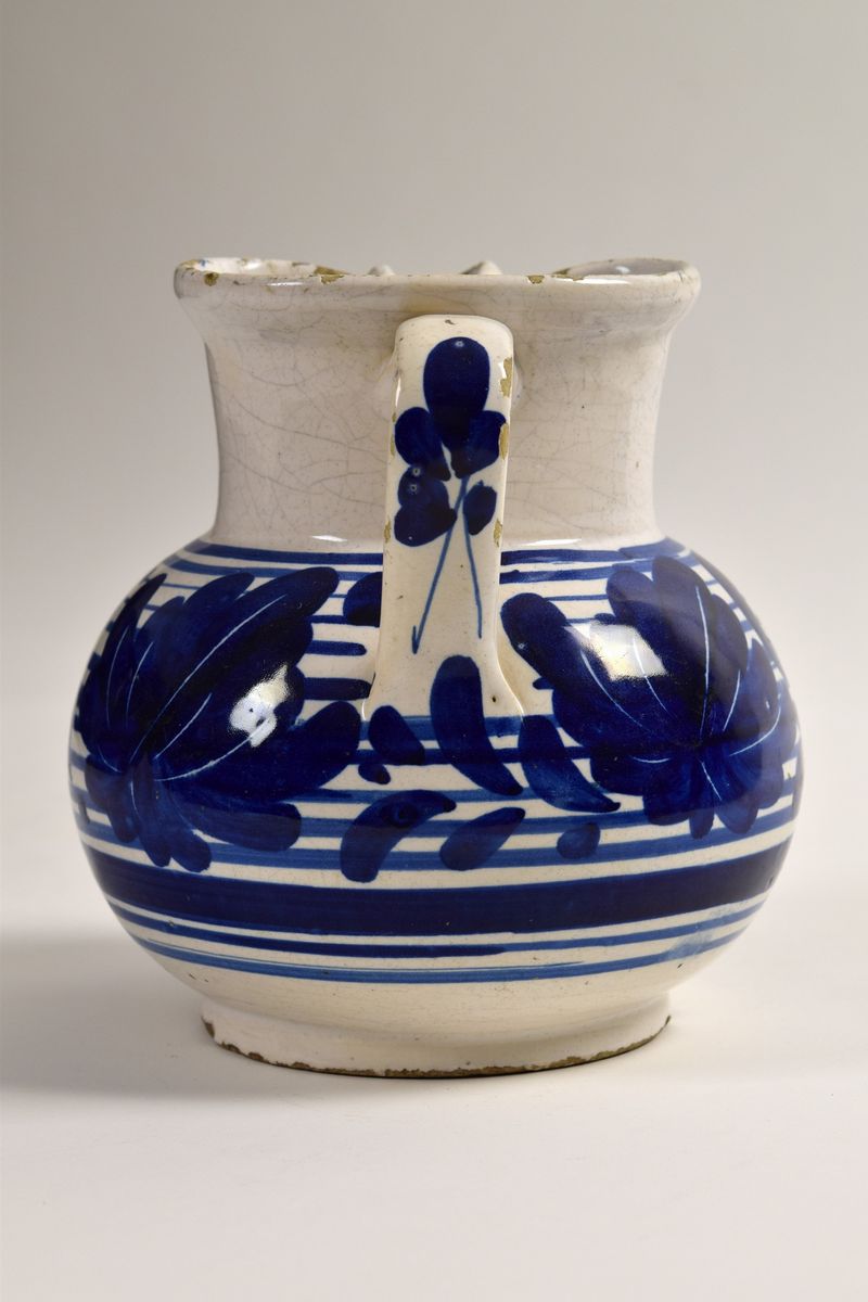 Brocca in maiolica policroma a bocca trilobata evidenziata da fiori, corpo decorato a motivi floreali e righe orizzontali nei toni del blu.