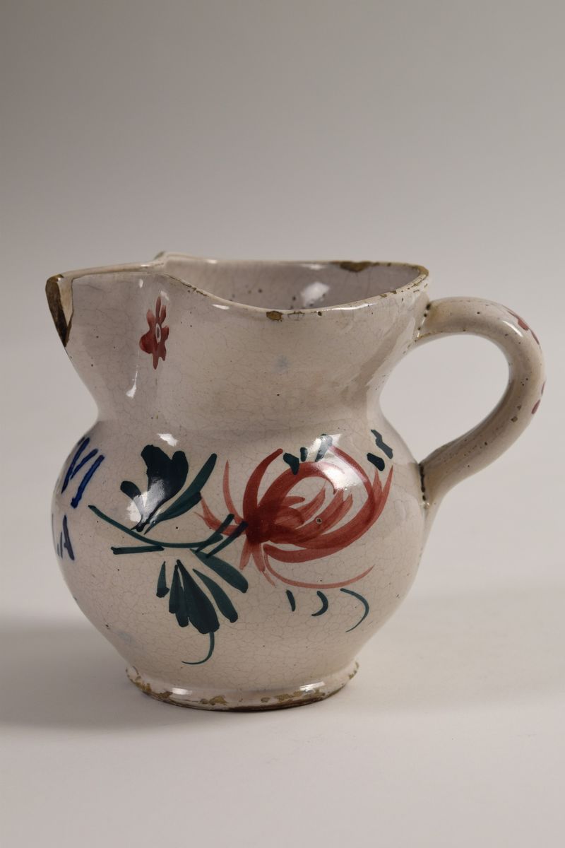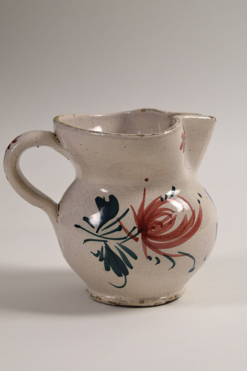 Piccola brocca in ceramica policroma smaltata bianca, bocca trilobata evidenziata da fiori, corpo con al centro la scritta "Bevi Bella" in blu ed ai lati fiori dipinti.