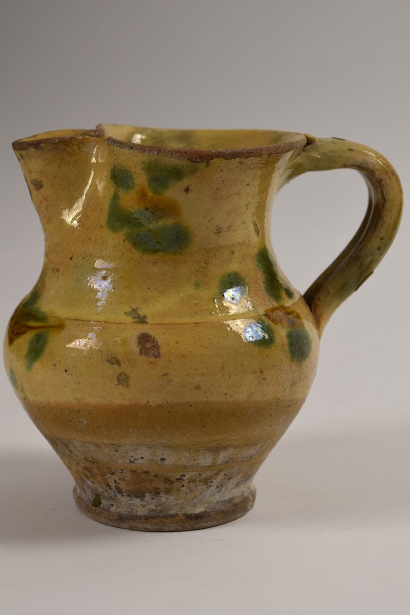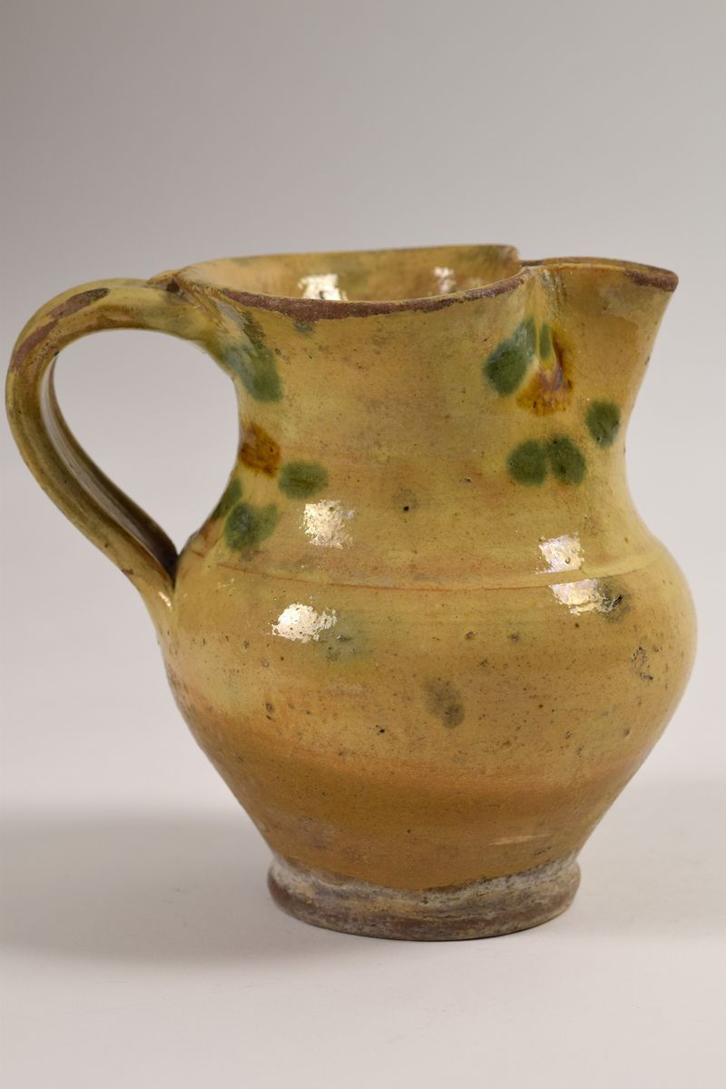 Piccola brocca in ceramica smaltata e decorata a piccoli fiori verdi e bruni su fondo giallo e bocca trilobata.