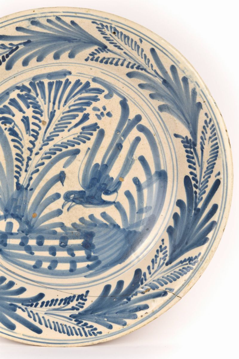 Grande piatto fondo in maiolica policroma dipinta motivi vegetali nei toni del blu e azzurro.