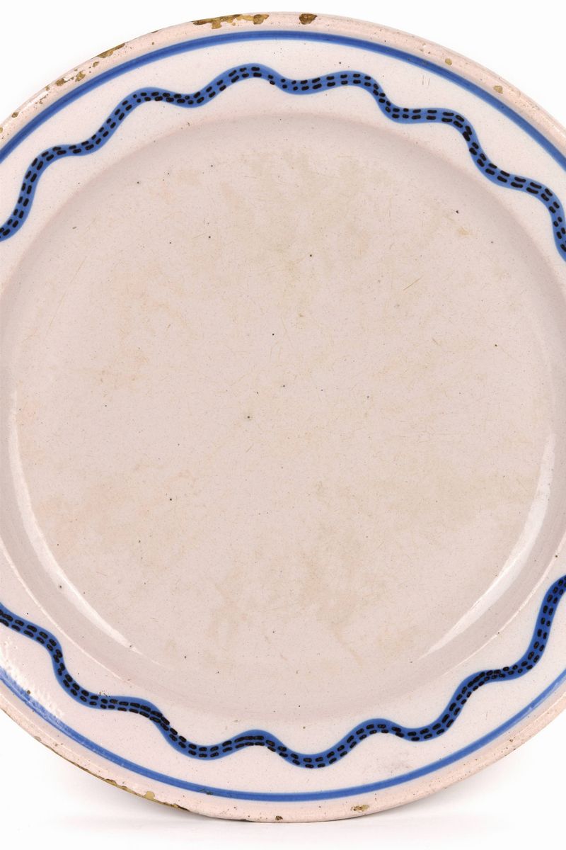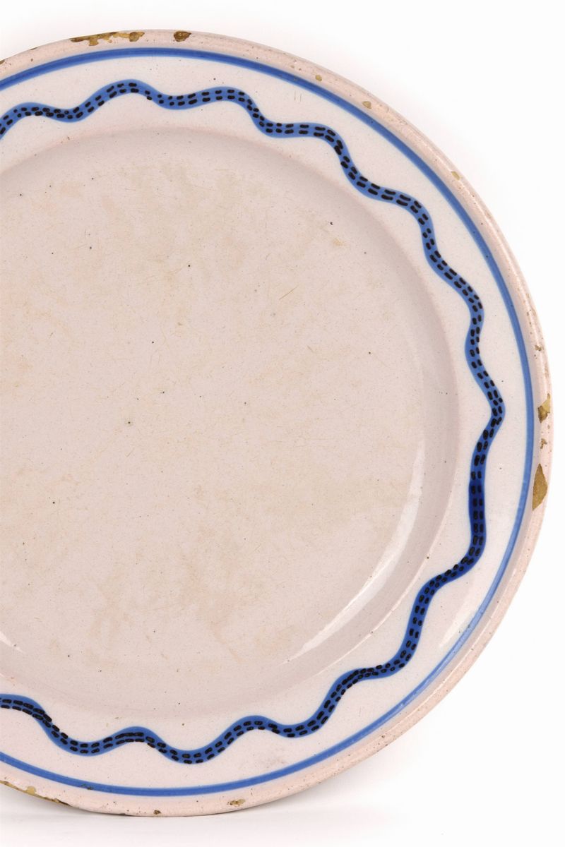 Grande piatto in maiolica smaltata a tesa decorata motivi con a nastro blu e tratteggi neri.