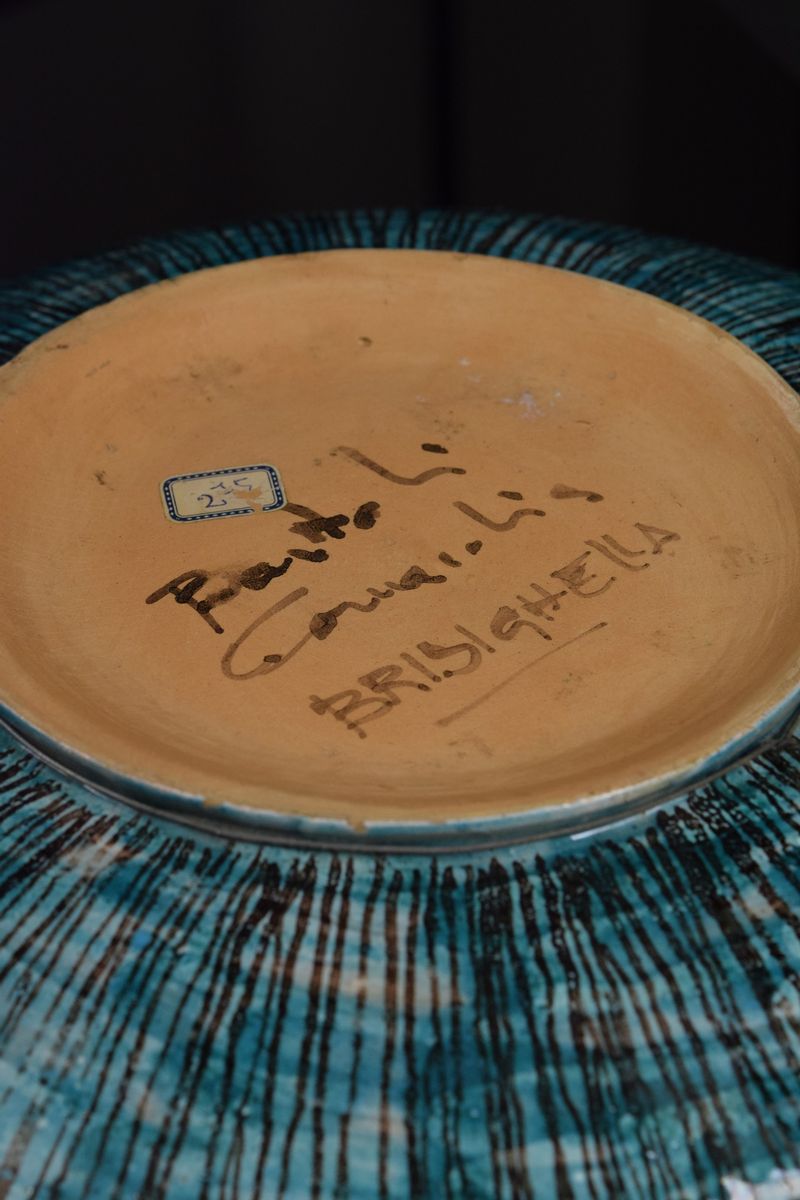 Grande ciotola in ceramica policroma a fondo verde con motivi informali.
