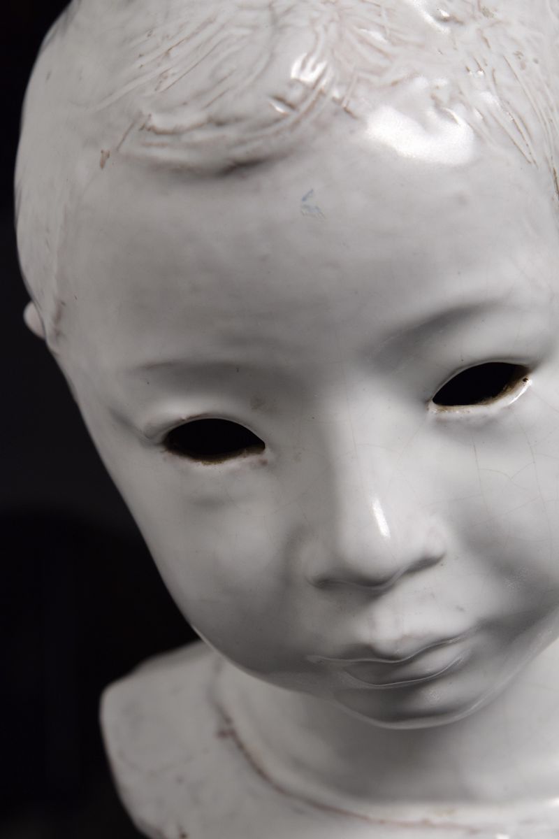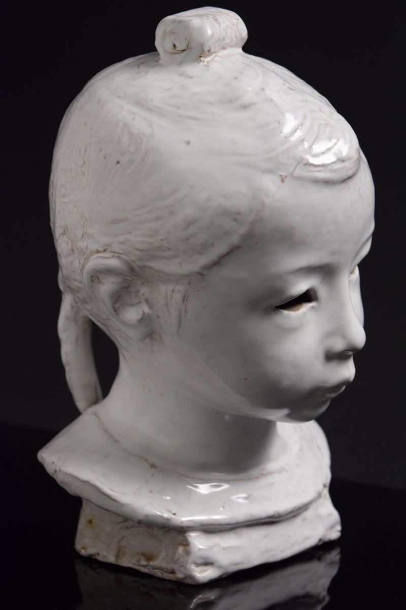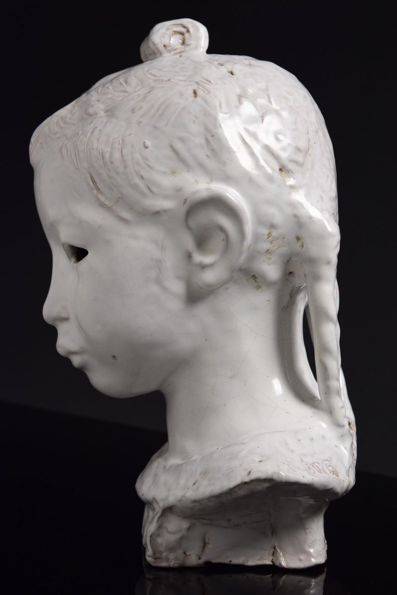 Testa di bimba cinese con treccine in ceramica monocroma a smalto in bianco. Da un bozzetto del 1927