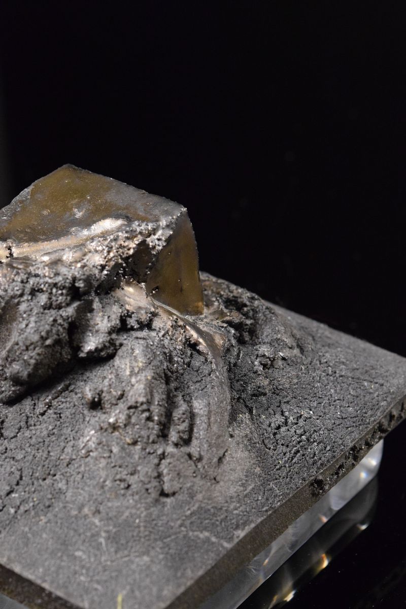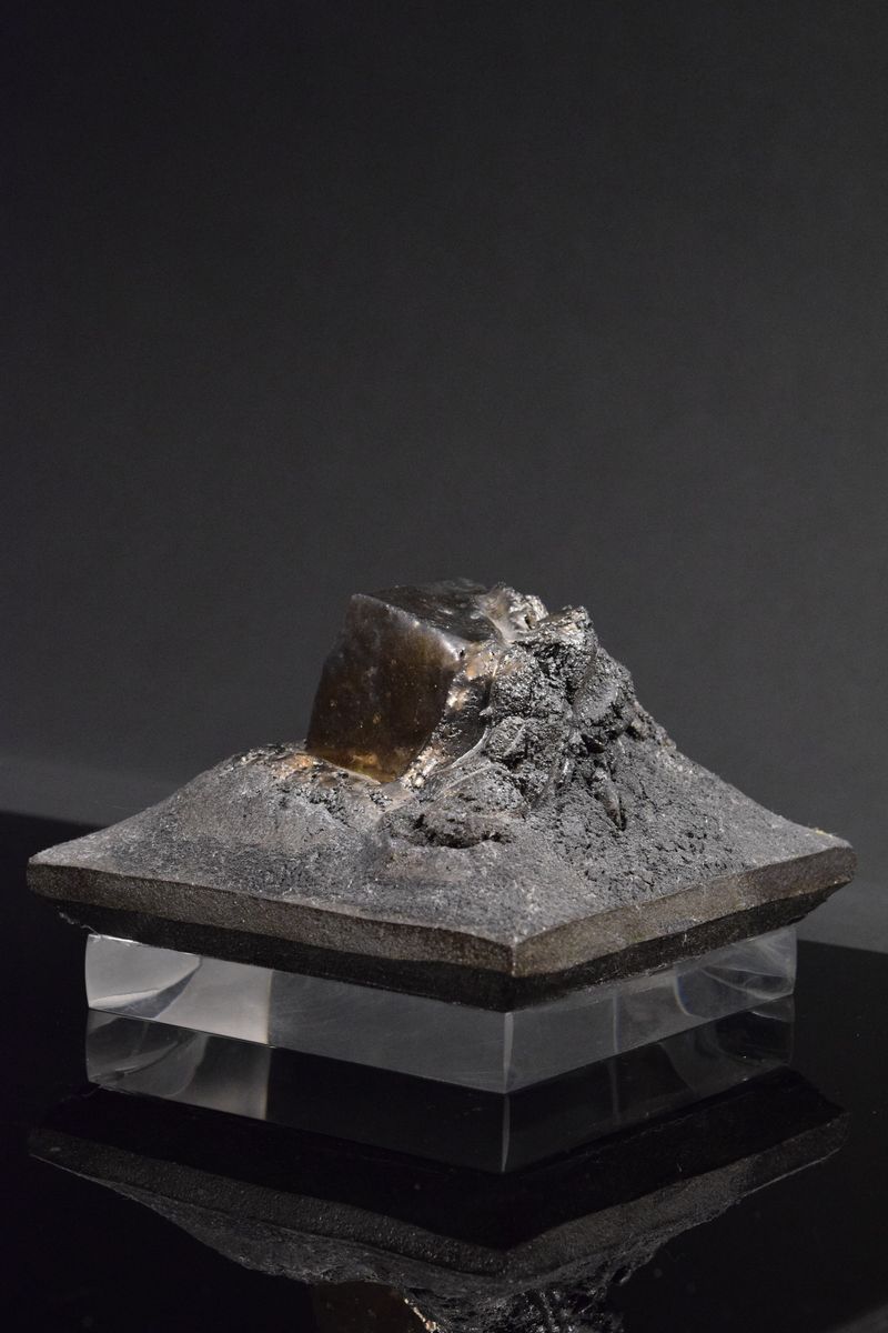 Cubo in grès effetto bronzo immerso in grès lavico mat. Montato su base in plexiglass.