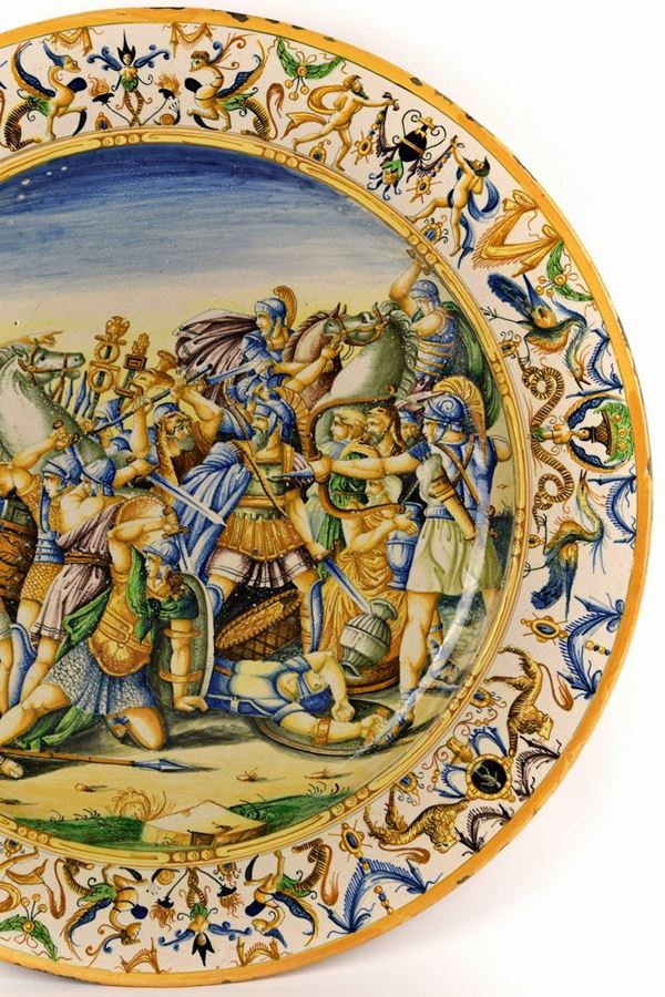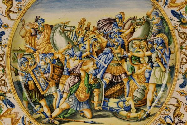 Grande piatto in maiolica policroma dipinta con tesa a grottesche e nel cavetto battaglia di epoca romana.
