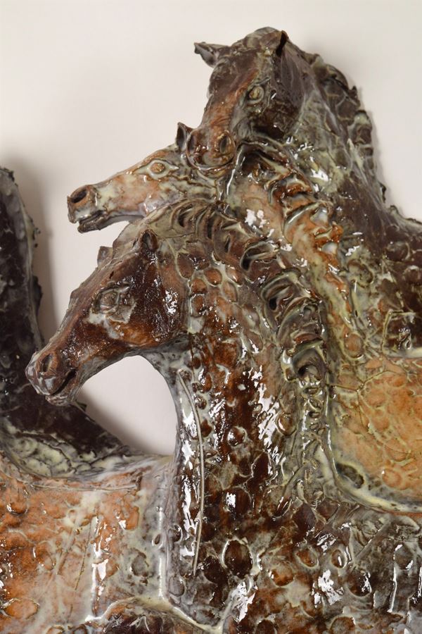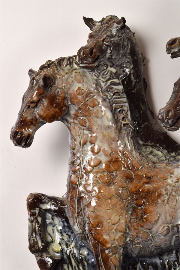 Altorilievo in ceramica policroma con cinque cavalli al galoppo.