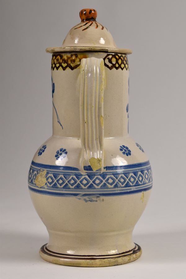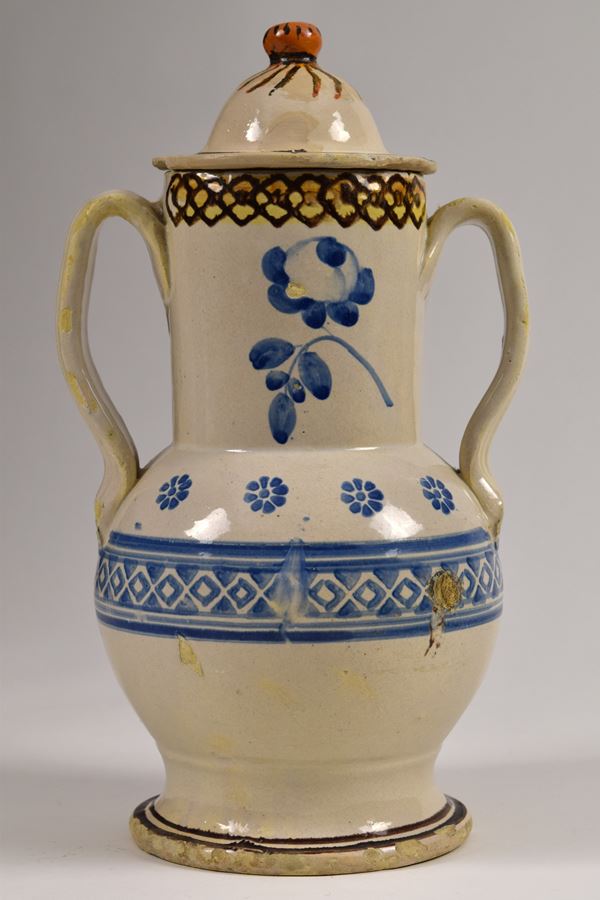 Brocca a due manici in ceramica policroma con coperchio, decorata a fiori e motivi geometrici.