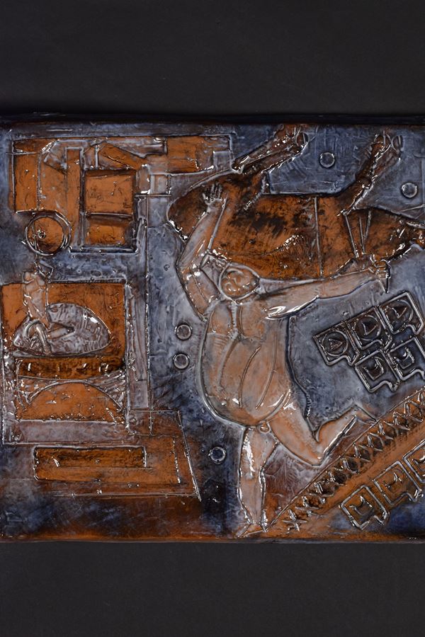 Pannello in ceramica policroma raffigurante una fatica di Ercole.