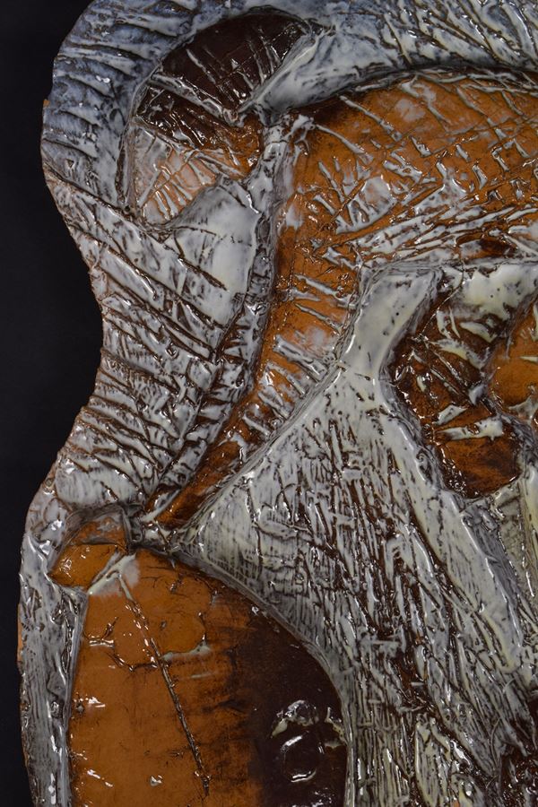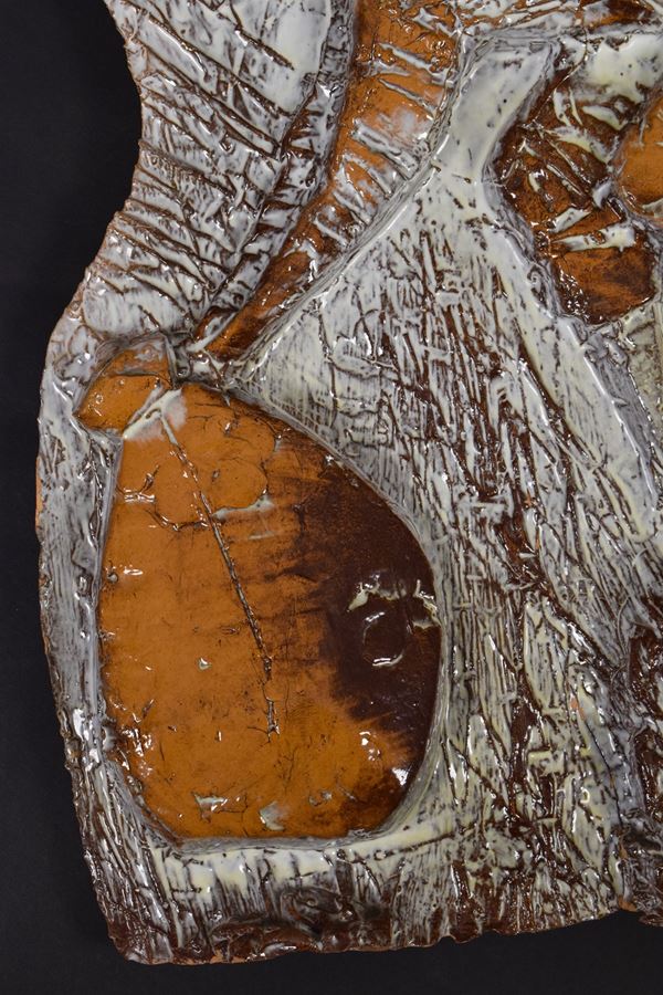 Pannello scontornato in ceramica policroma con figura di contadino.