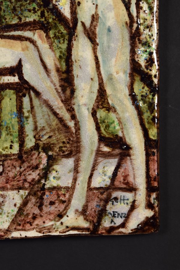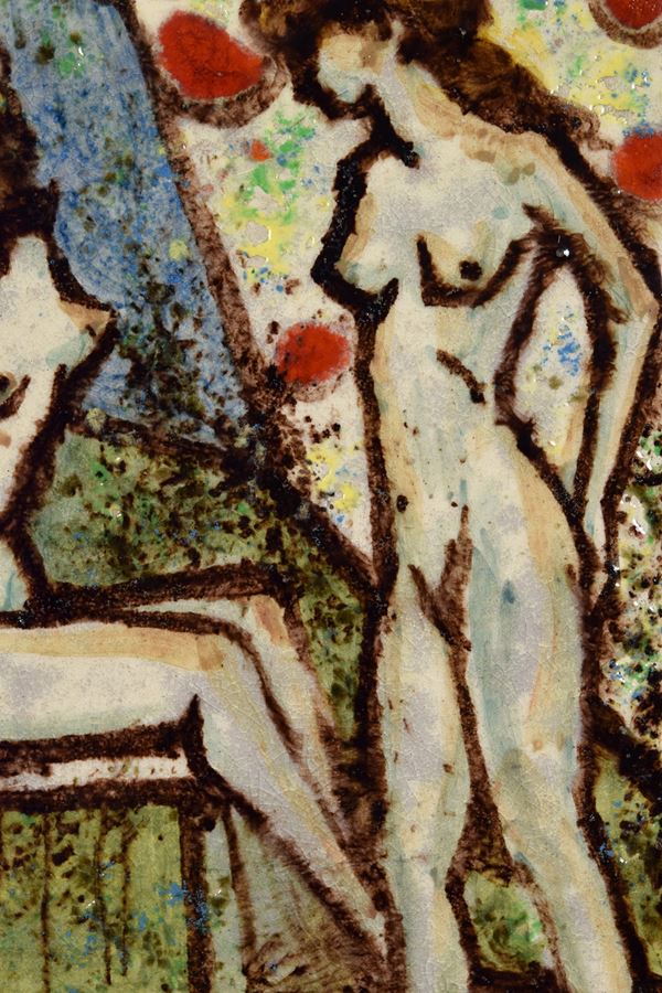 Piastra in ceramica policroma dipinta con coppia di nudi femminili.