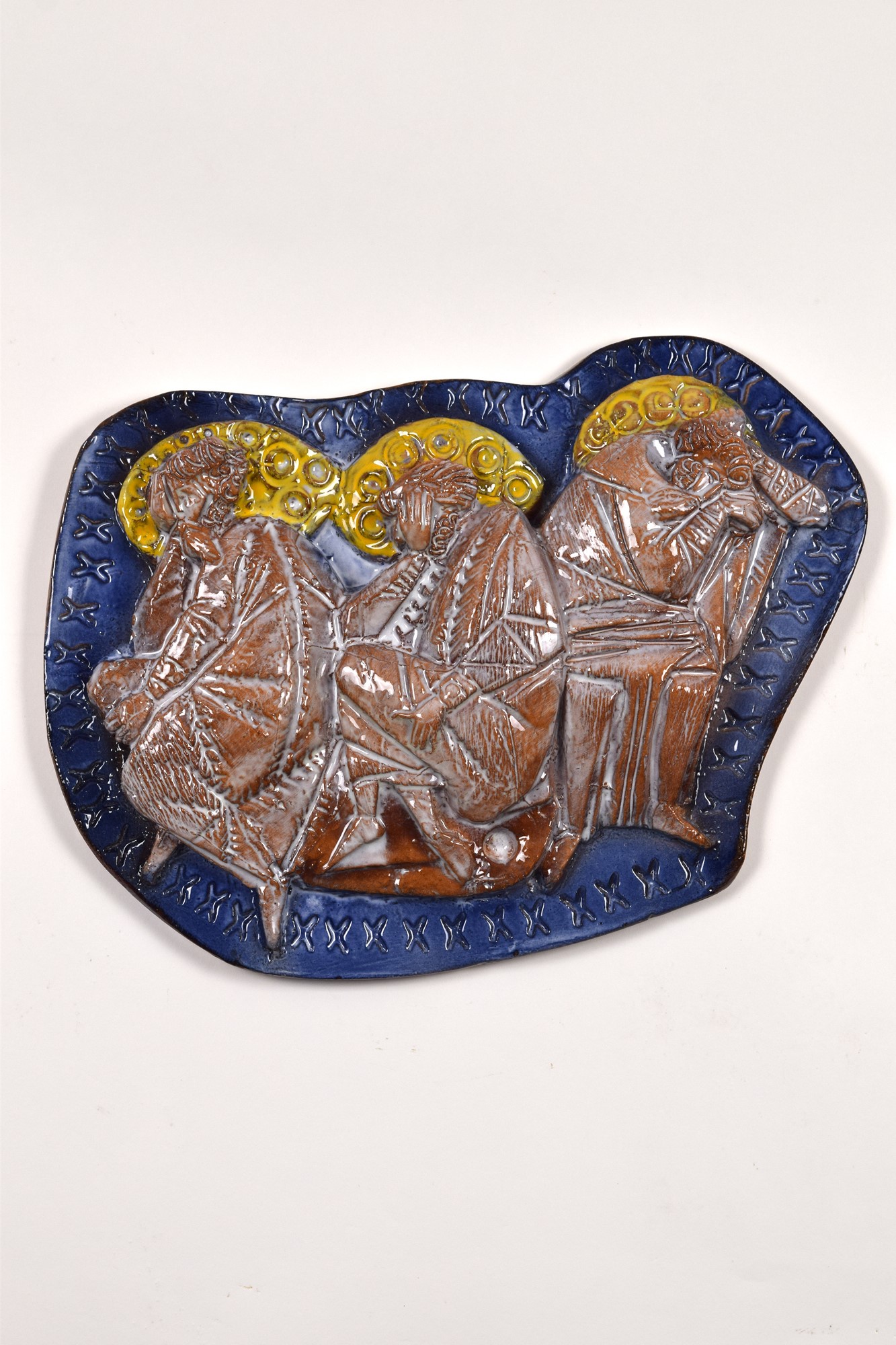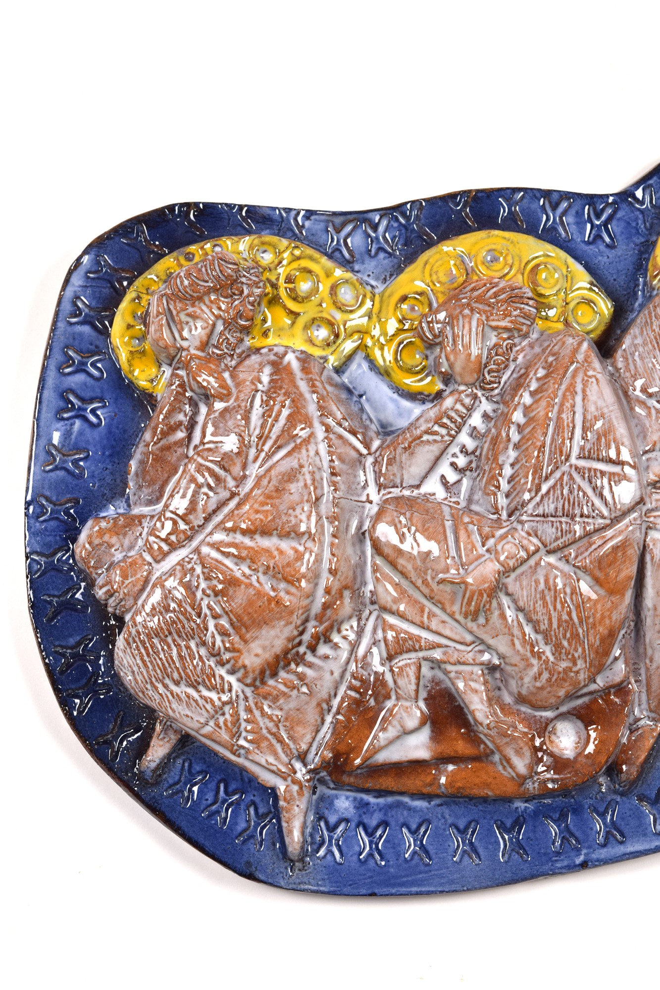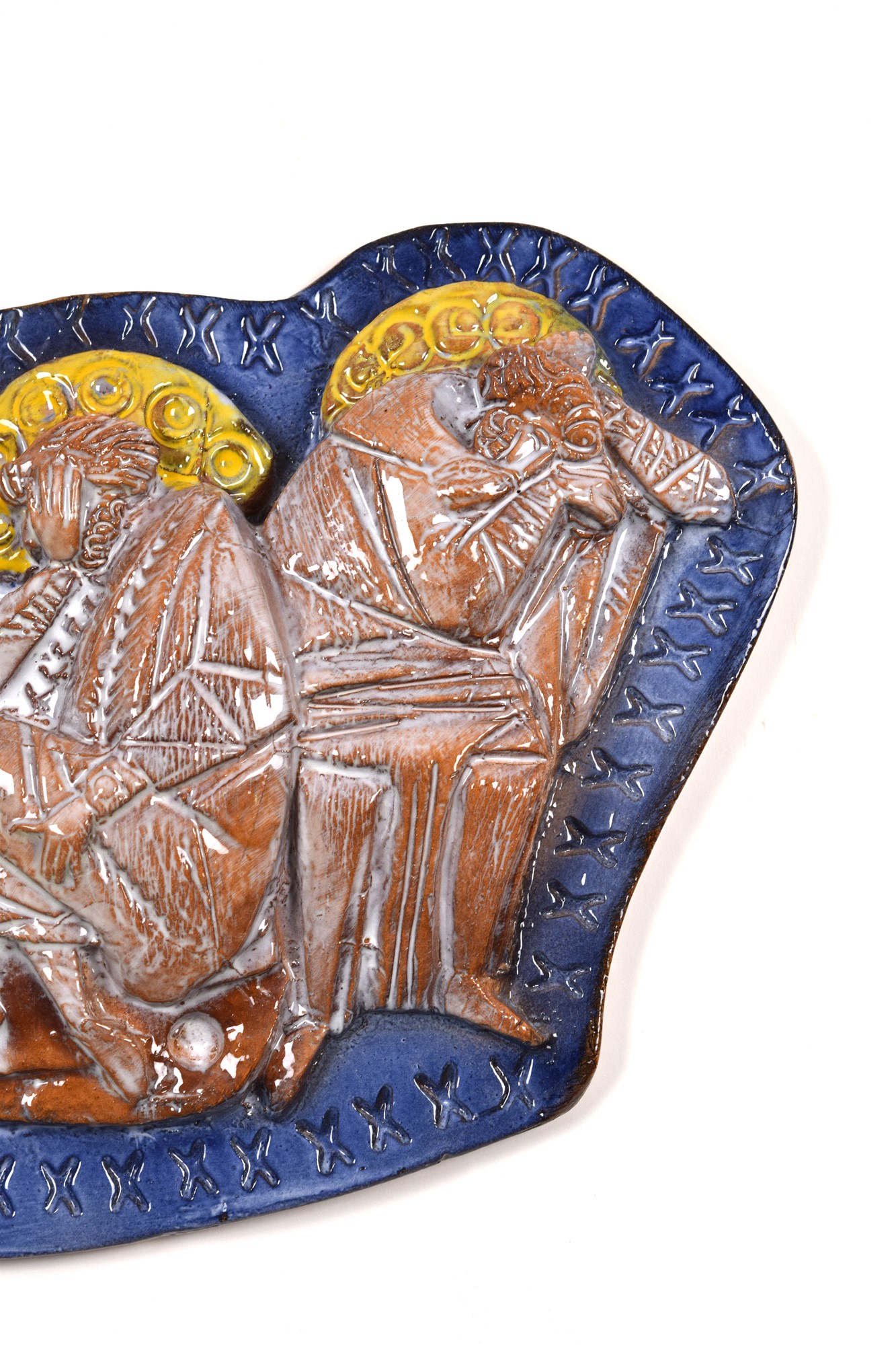 Pannello scontornato a bassorilievo in ceramica policroma.