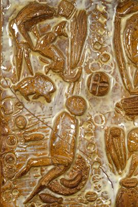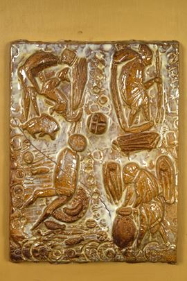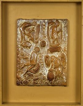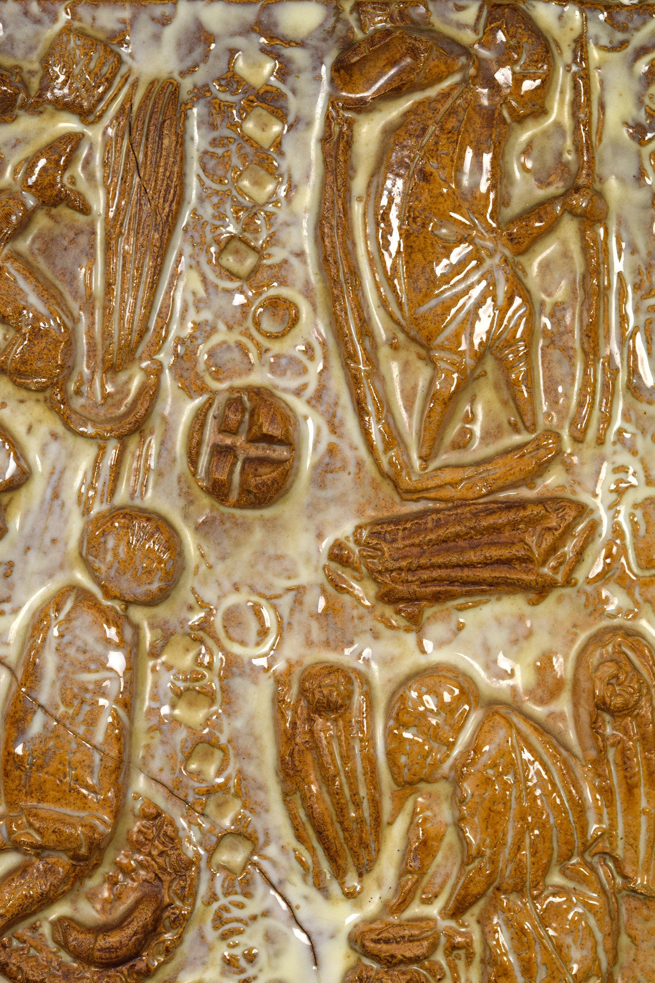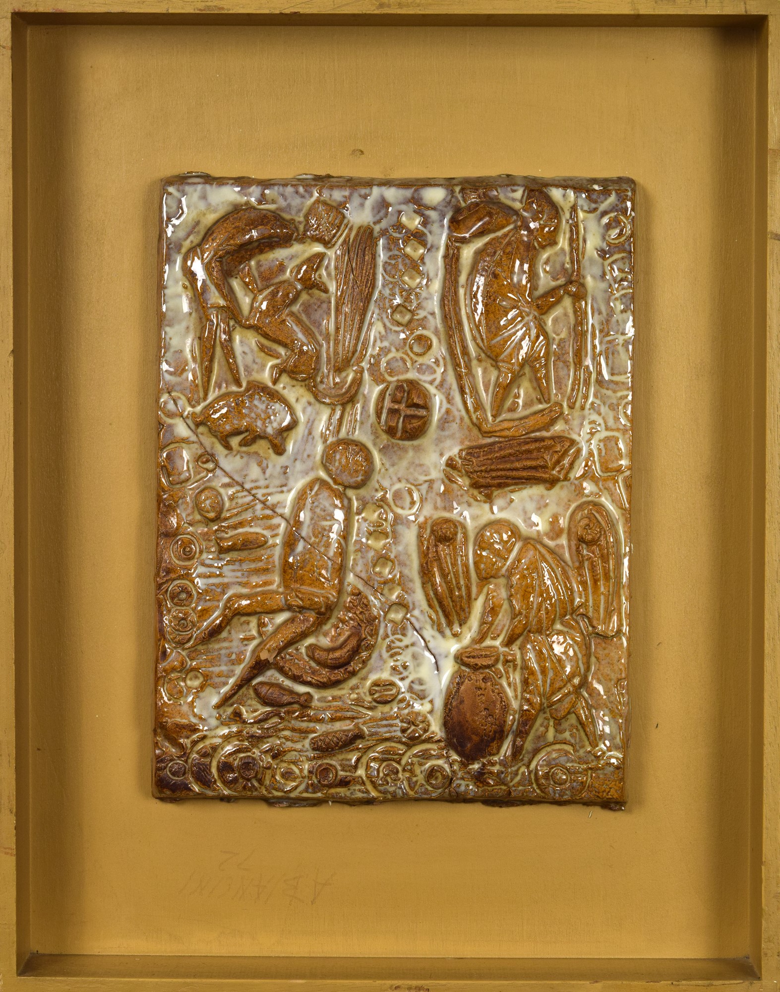 Pannello a bassorilievo in ceramica policroma. Montato su pannello a vassoio in legno.