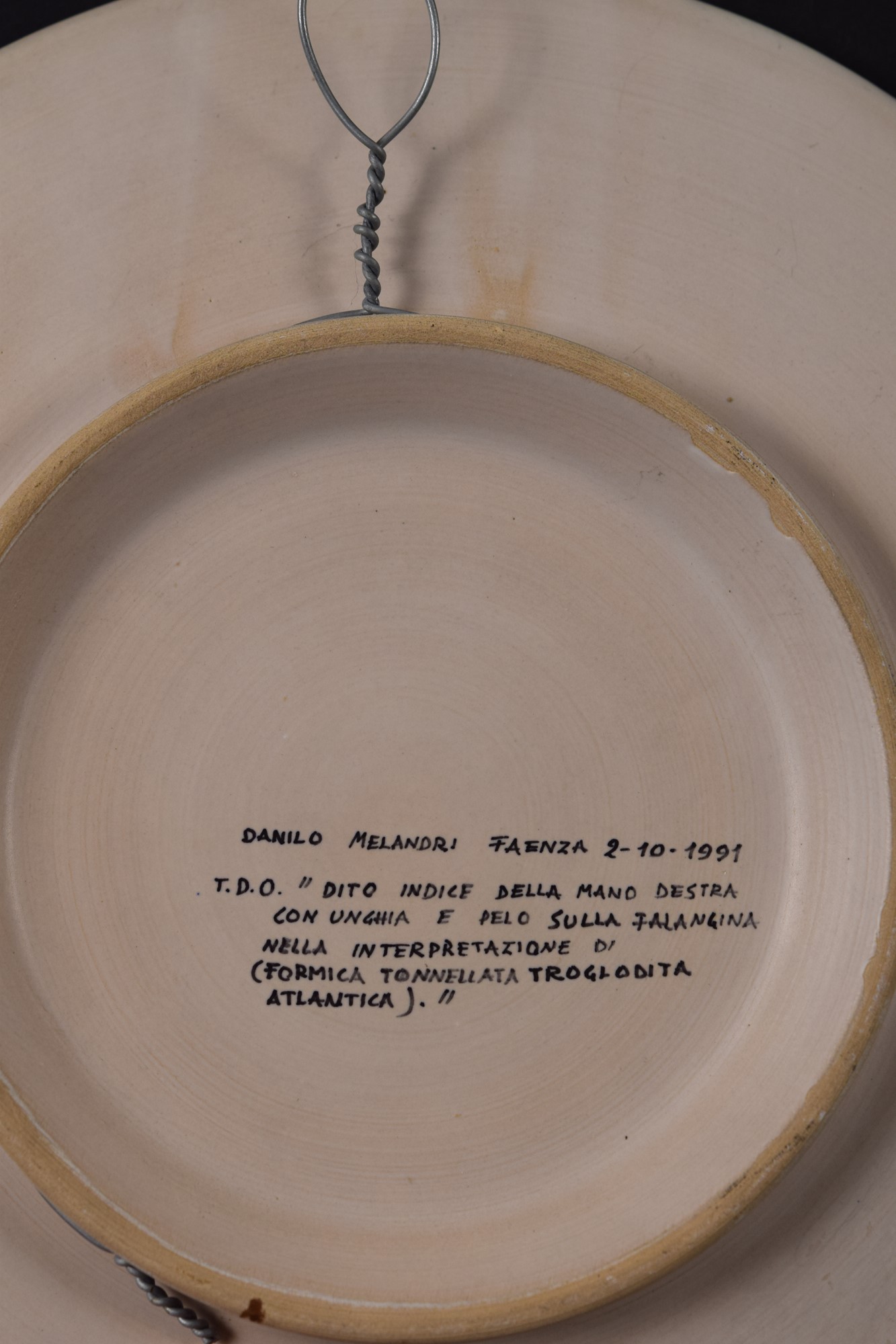 Nel retro "Danilo Melandri Faenza 2-10-1991 T.D.O. "Dito indice della mano destra con unghia e pelo sulla falangina nella interpretazione di (Formica Tonnellata troglodita atlantica)."