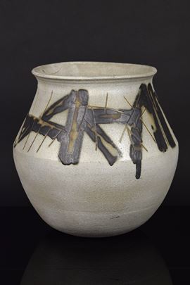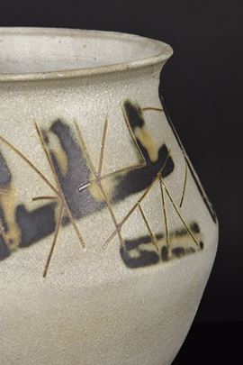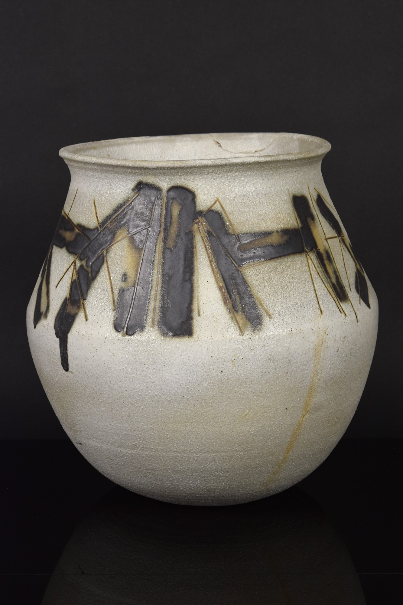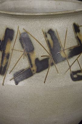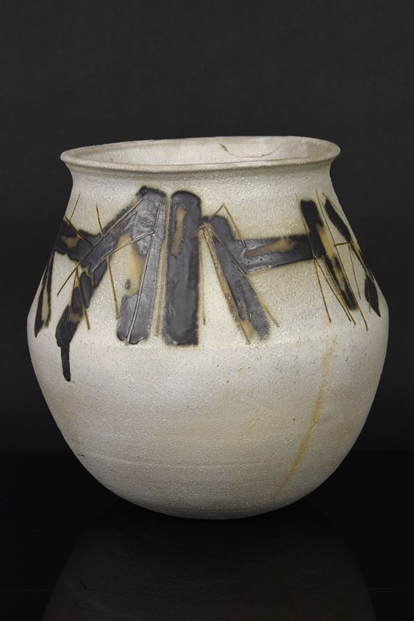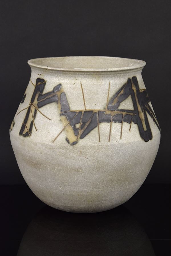 Grande vaso in grès graffito e motivi informali neri mat. Difetti.