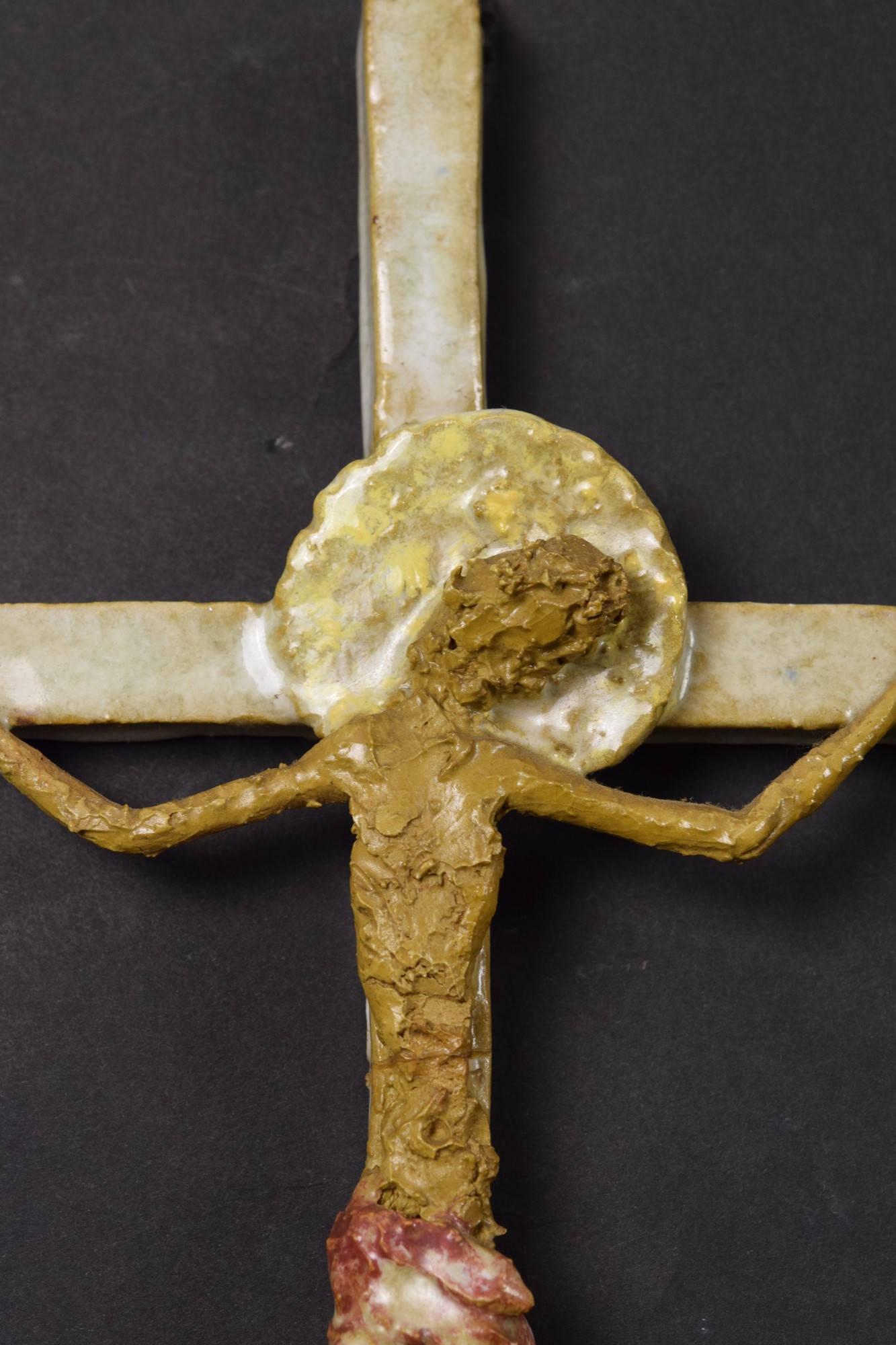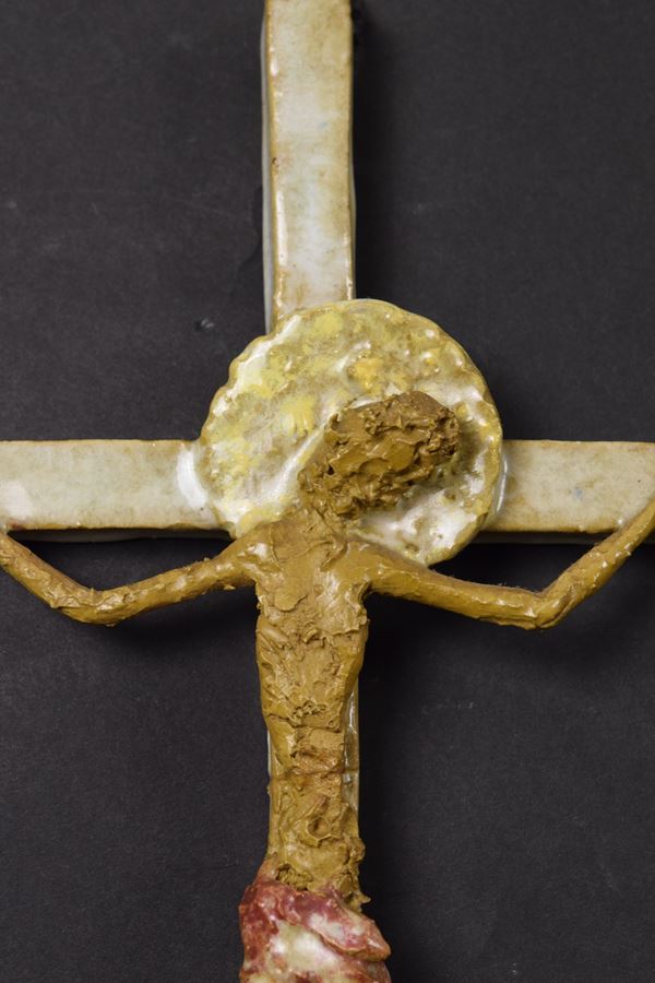Crocifisso in ceramica policroma modellato a mano.