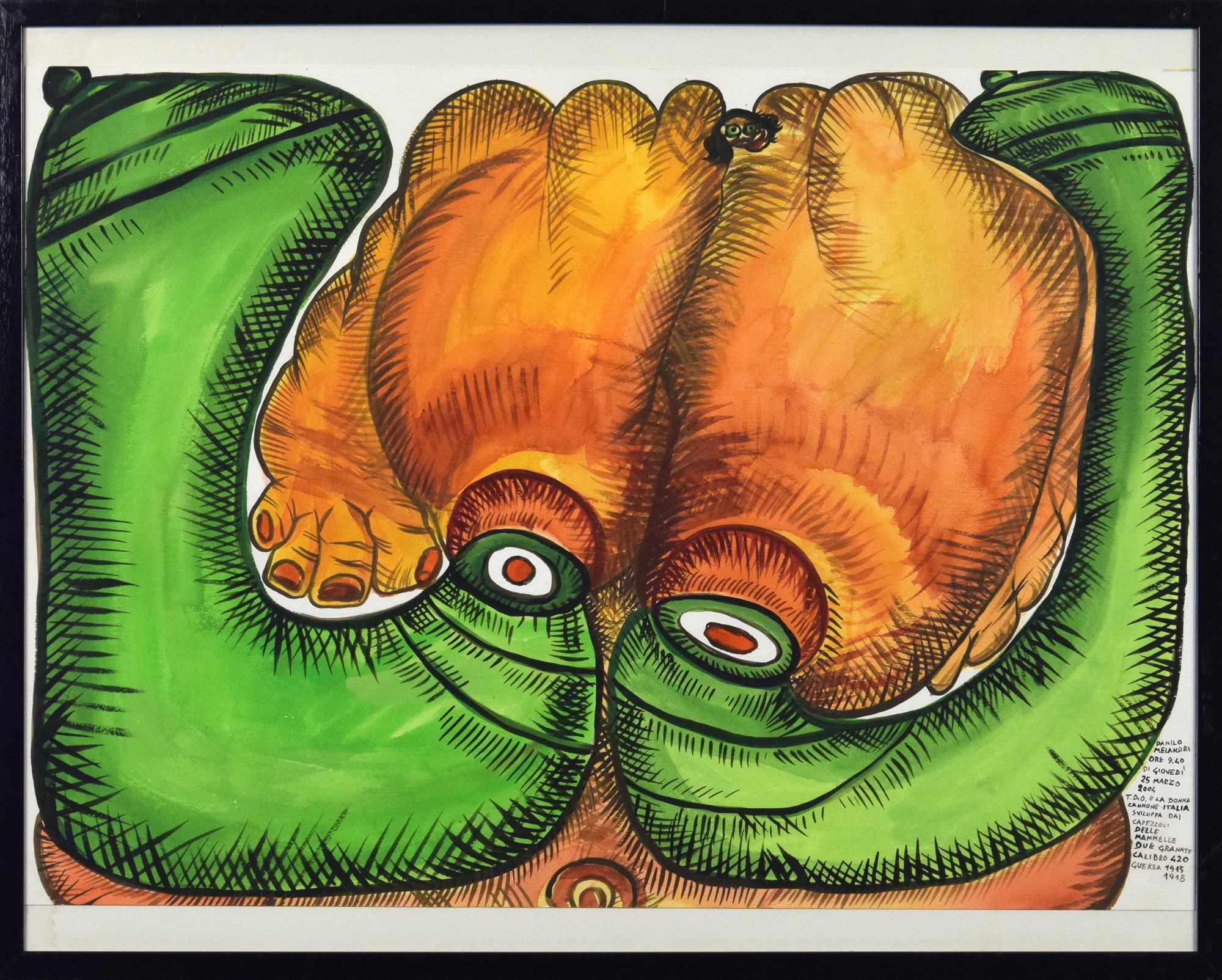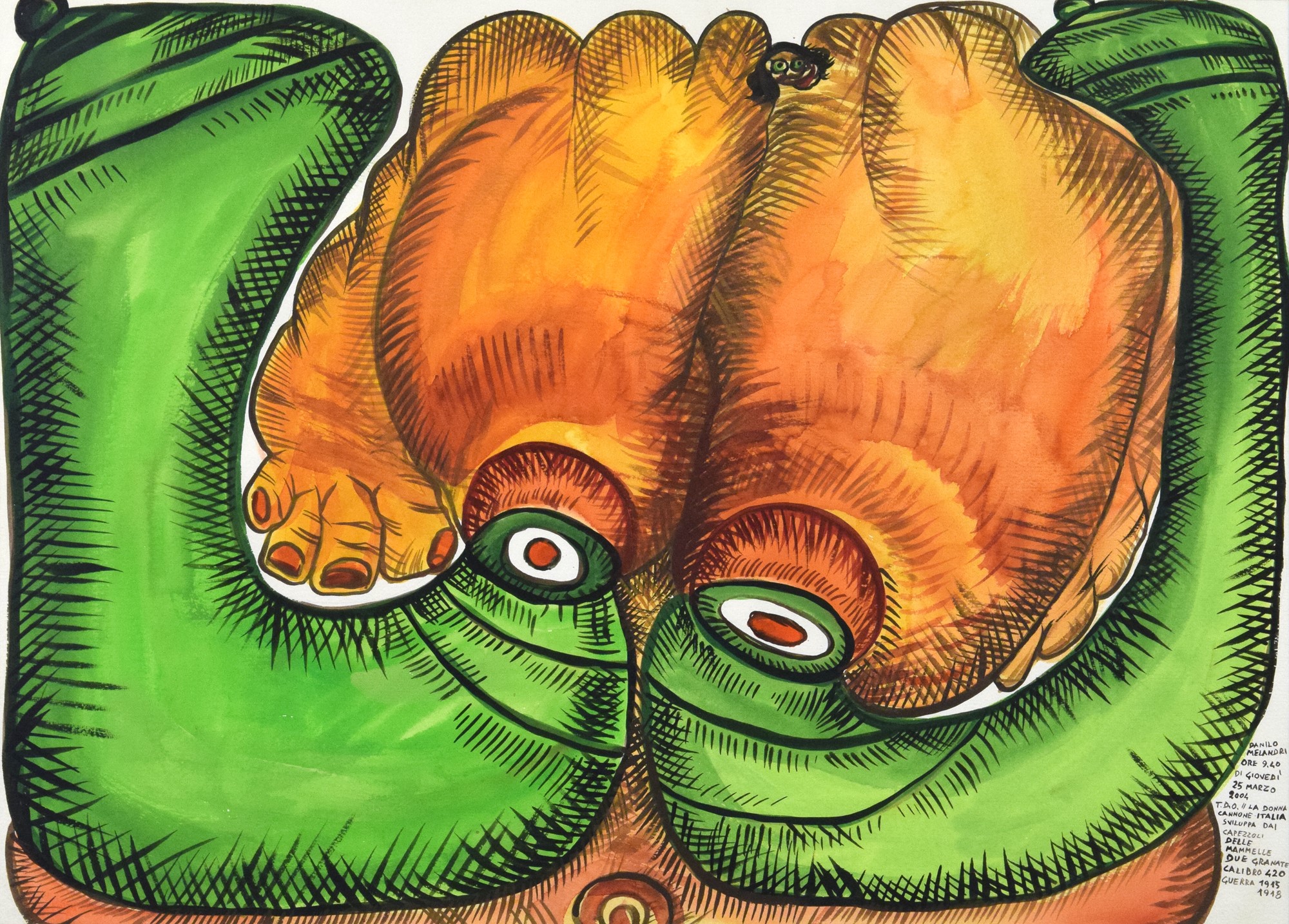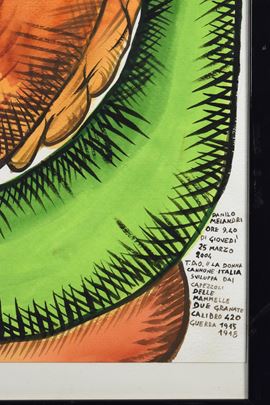 Firmato, datato e intitolato in basso a destra "Danilo Melandri ore 9:40 di giovedì 25 marzo 2004 T.D.O. "la donna cannone Italia sviluppa dai capezzoli delle mammelle due granate calibro 420 guerra 1915 1918".