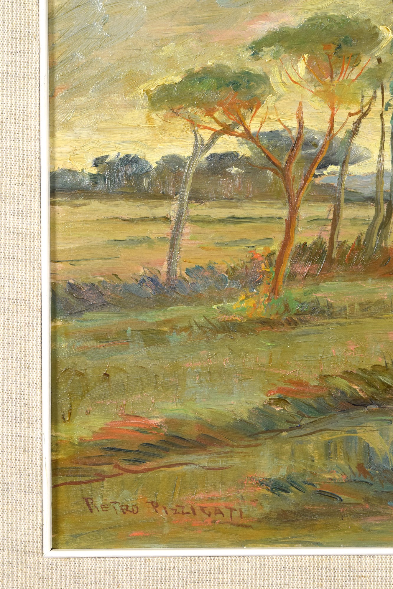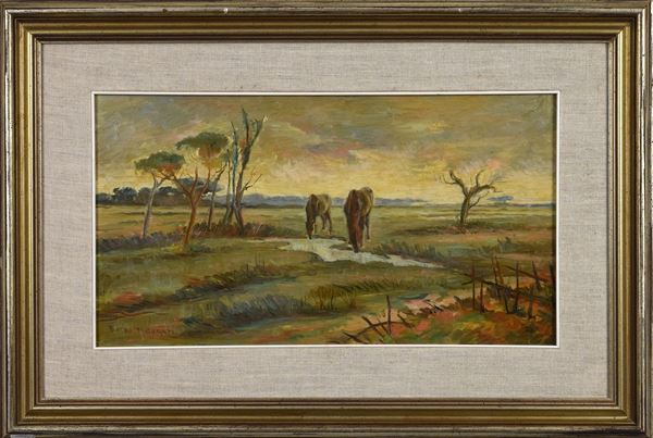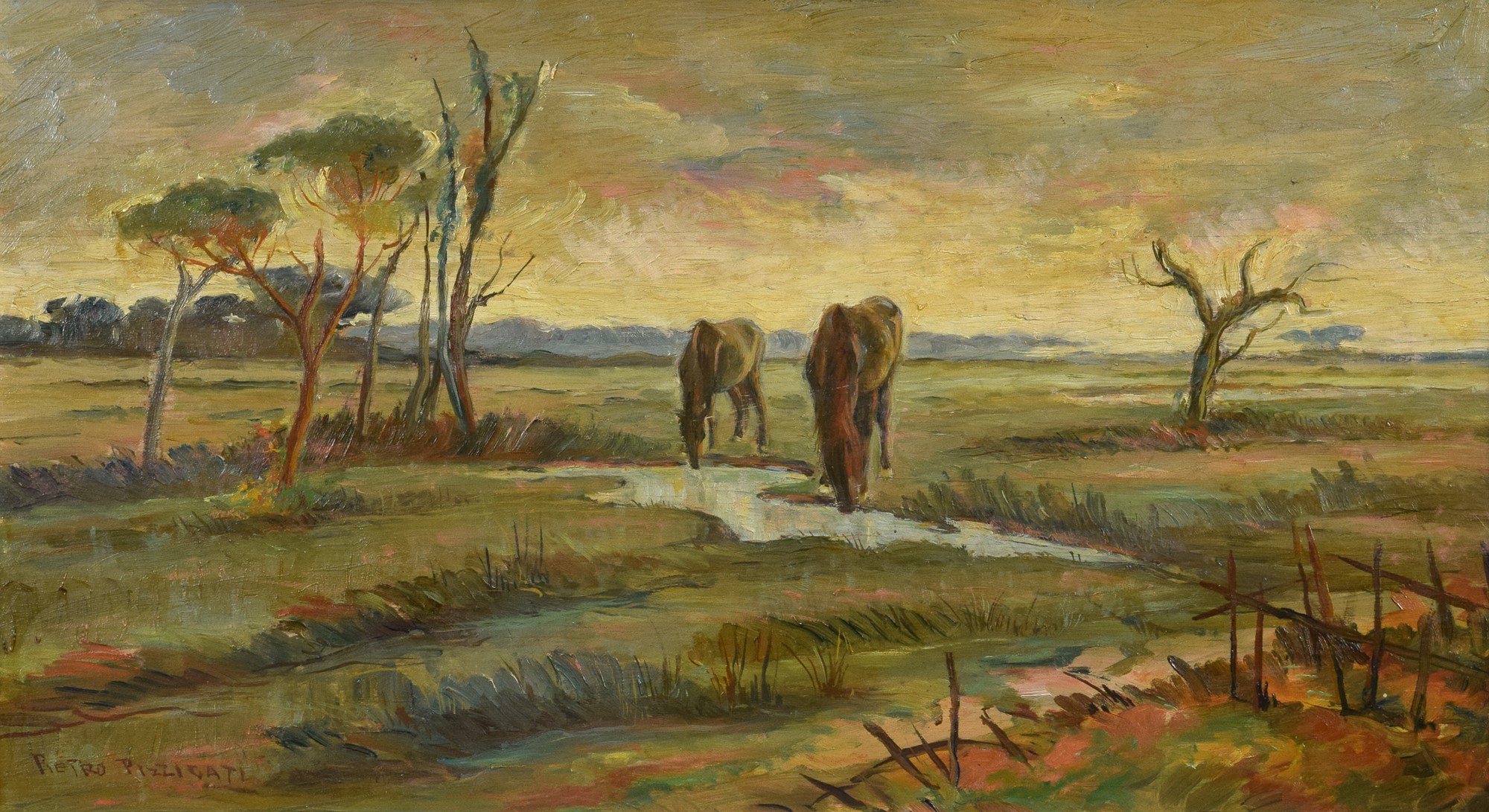 Firmato in basso a sinistra "Pietro Pizzigati". Intitolato nel retro "Paesaggio ravennate cavalli al pascolo".