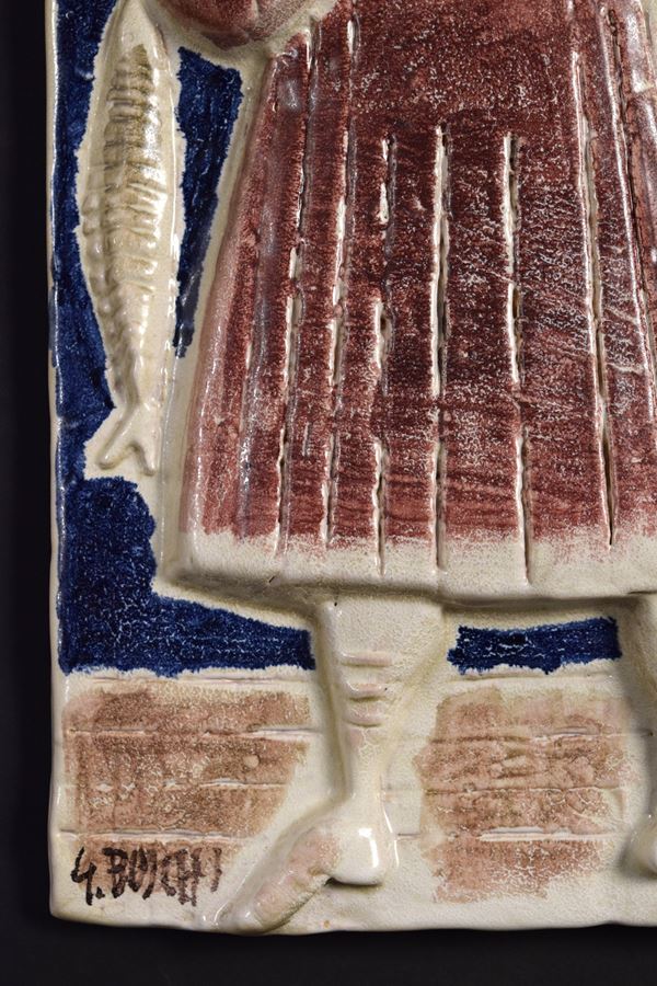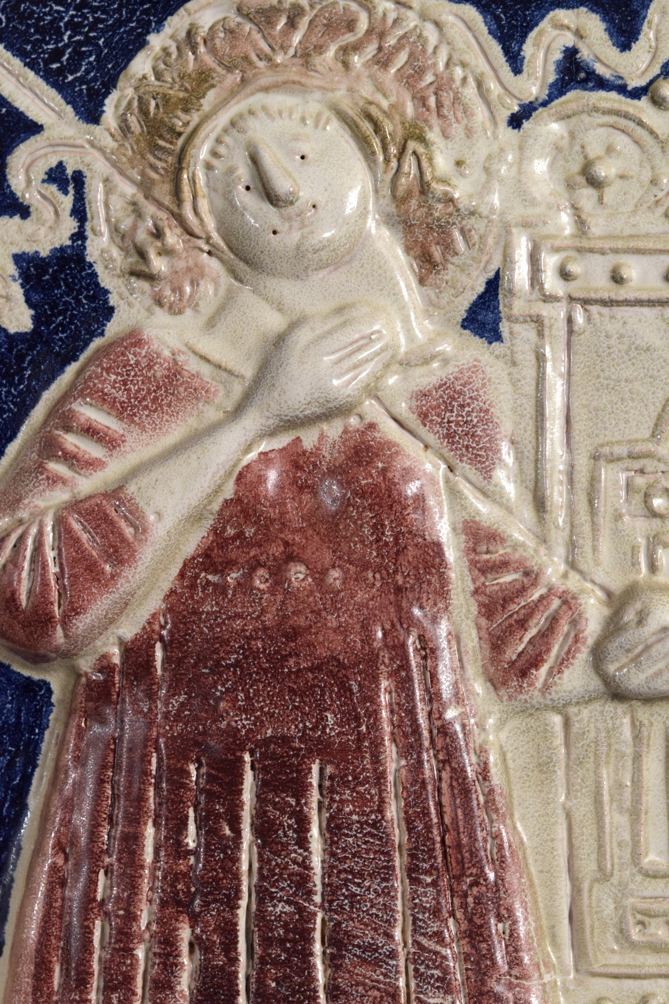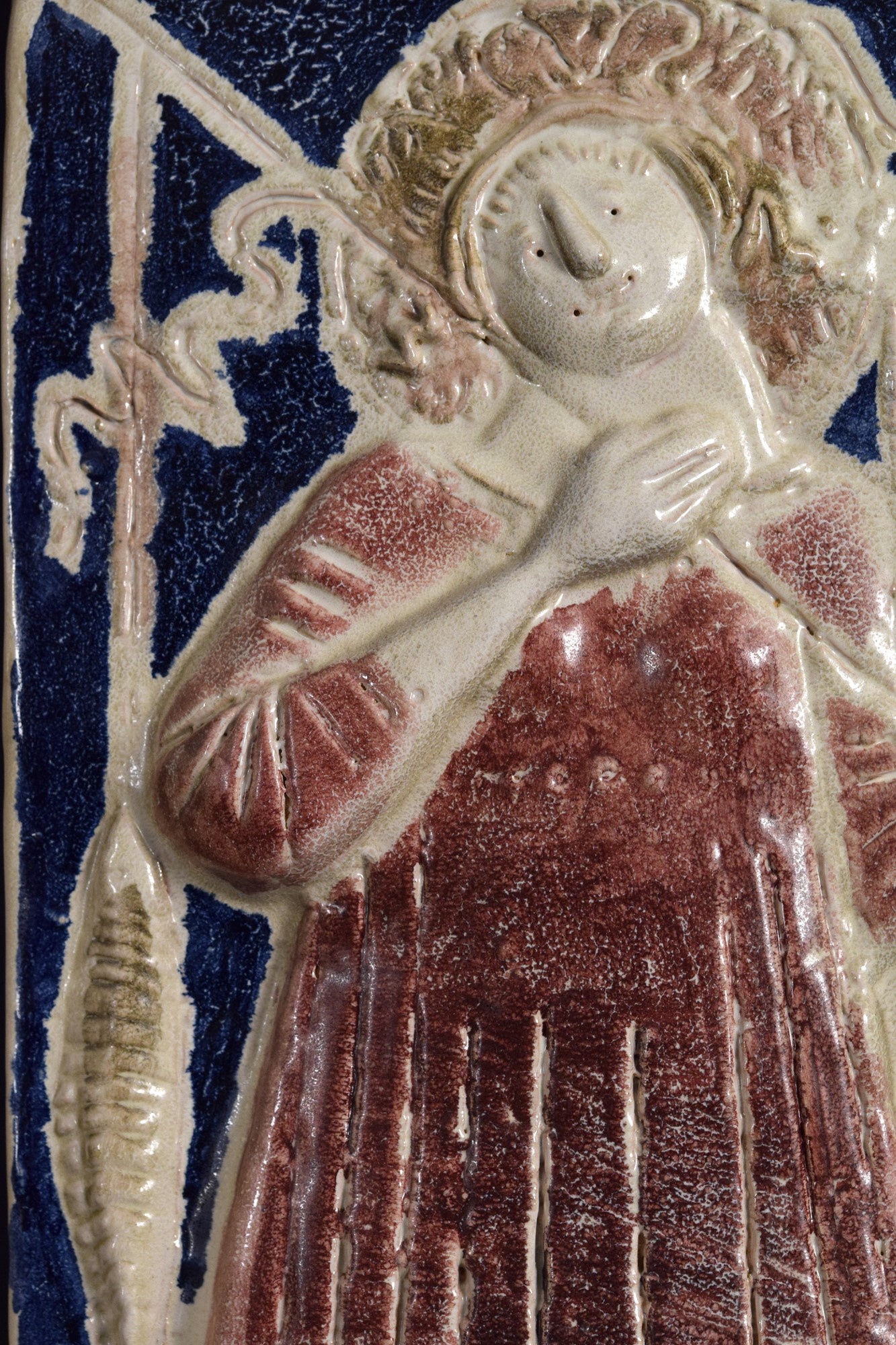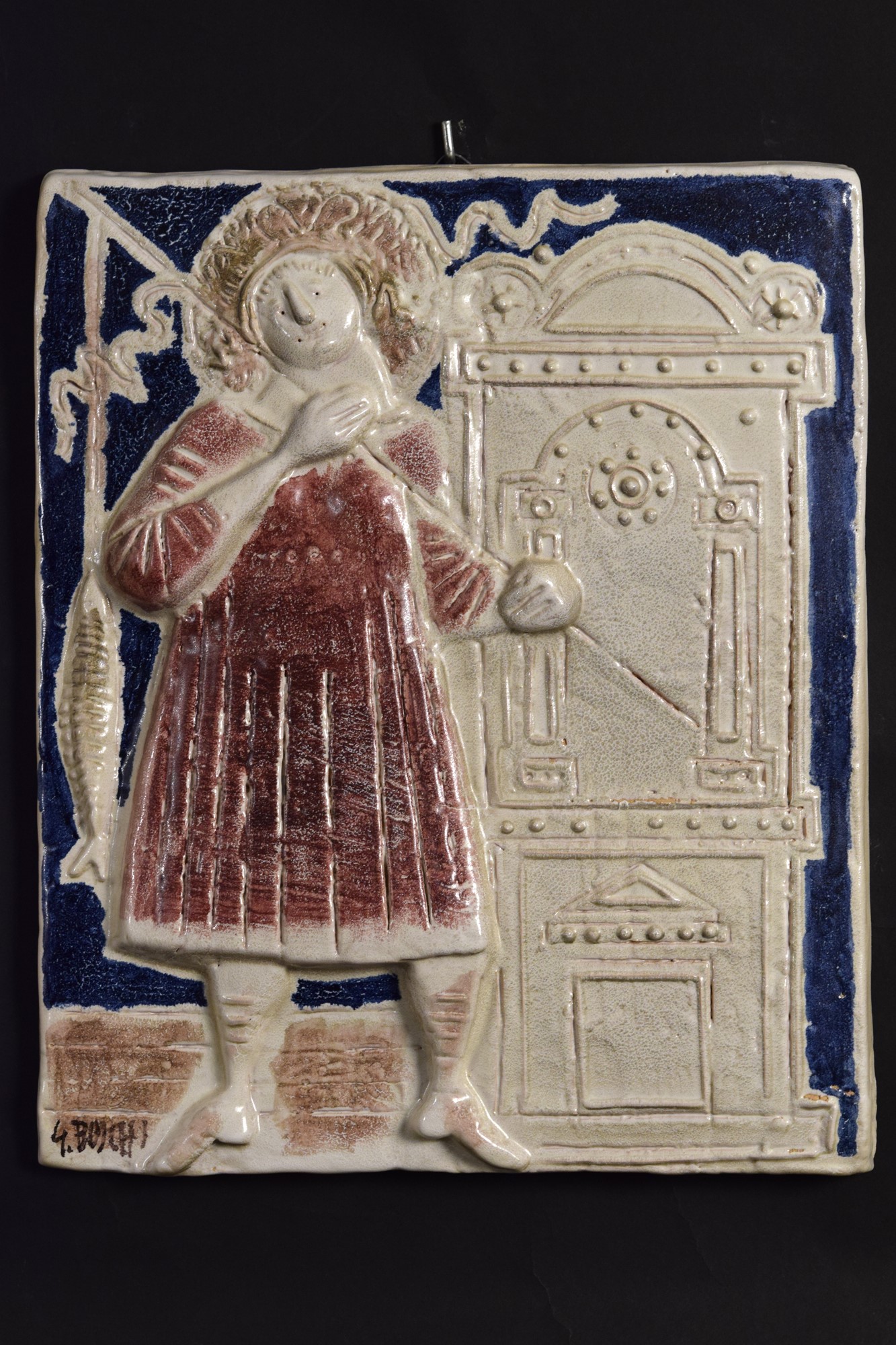 Pannello a bassorilievo in ceramica policroma raffigurante San Raffaele.