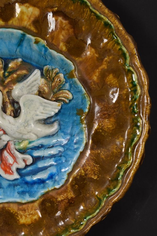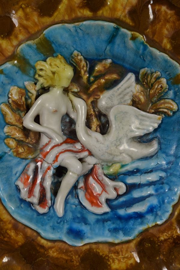 Grande piatto fondo in ceramica policroma con al centro raffigurati "La Leda & il Cigno" a rilievo.