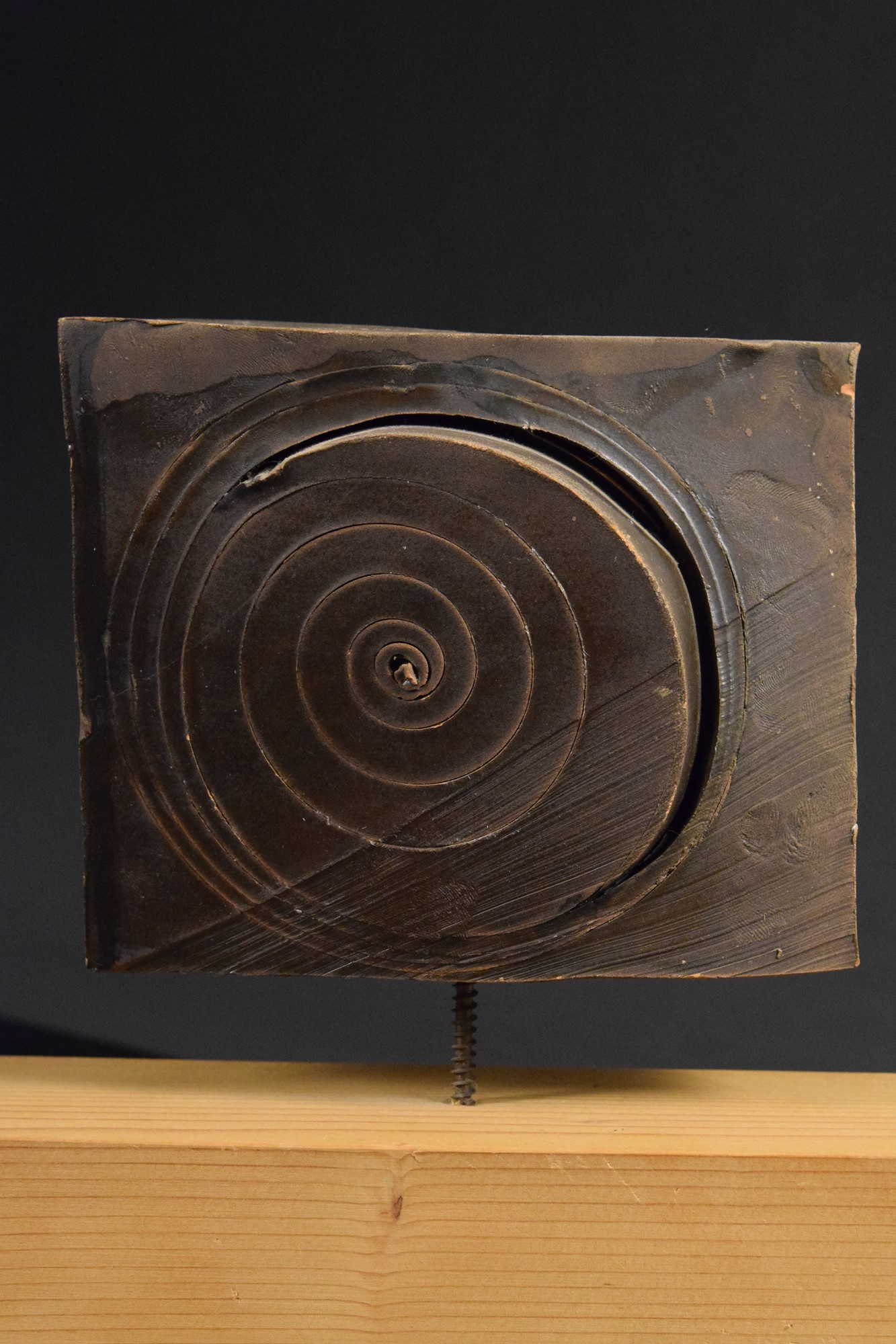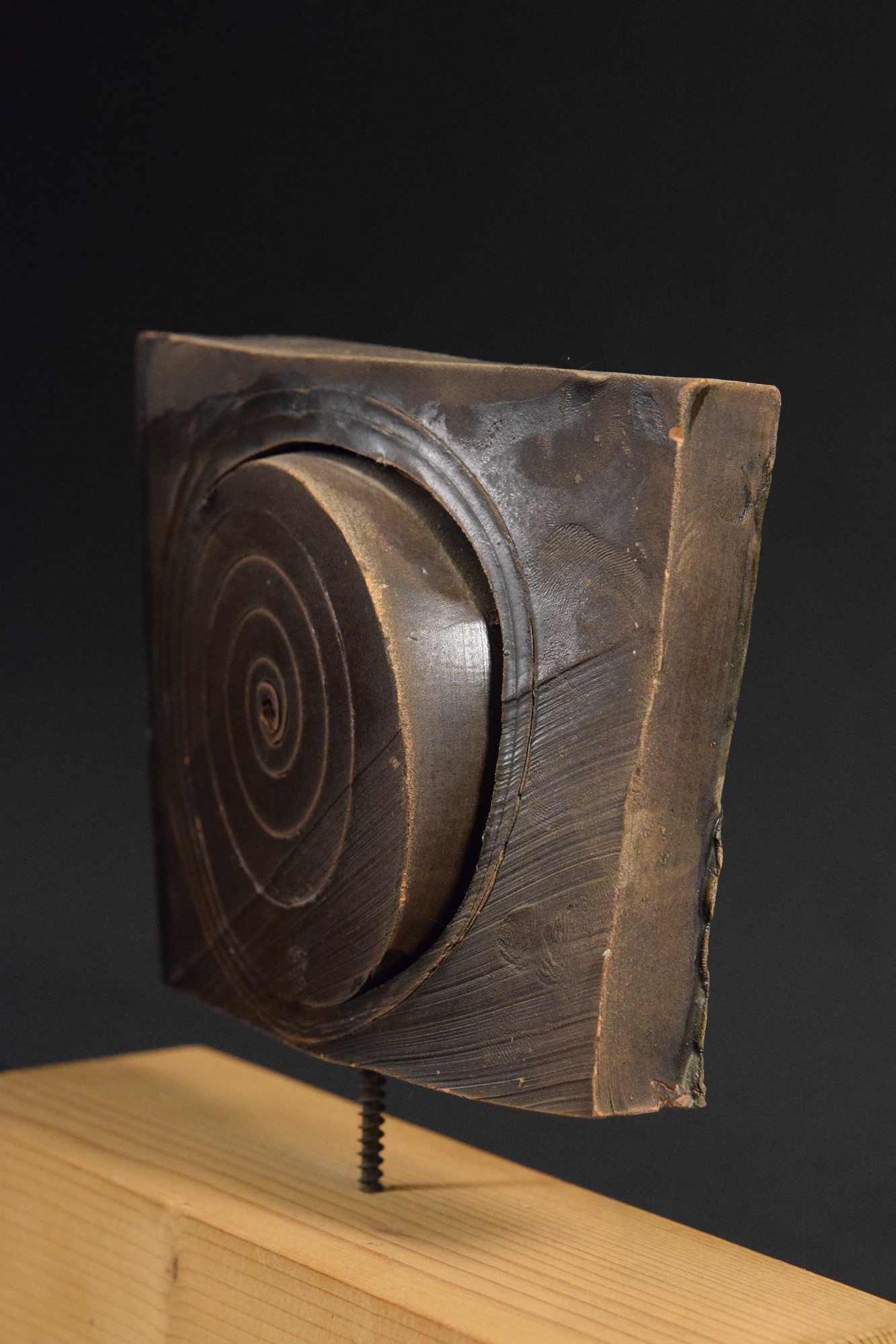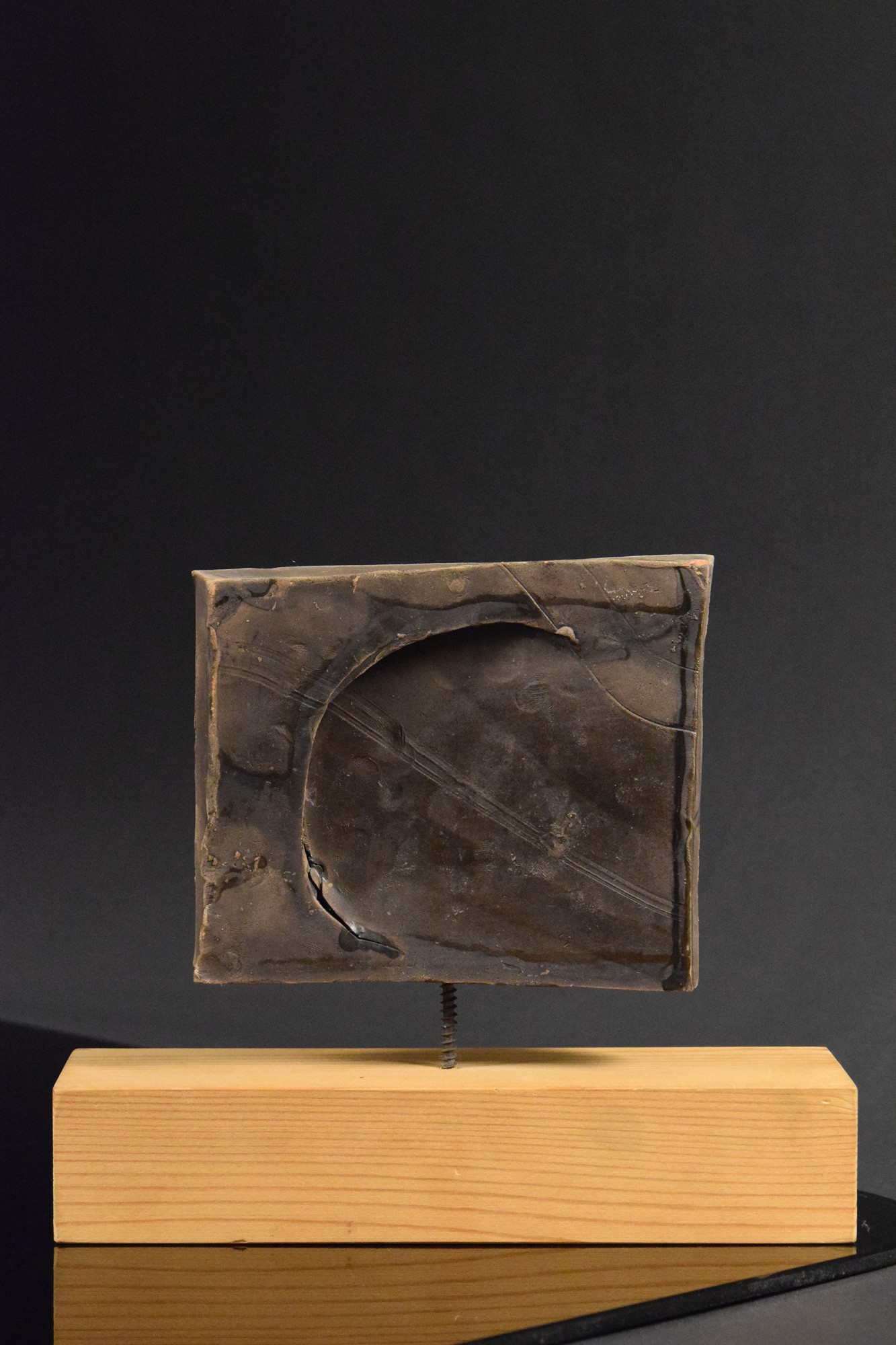 Terracotta di forma geometrica smaltata opaca con motivo a spirale inciso sul fronte. Montata su base in legno originale Leoni.