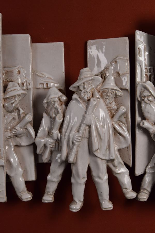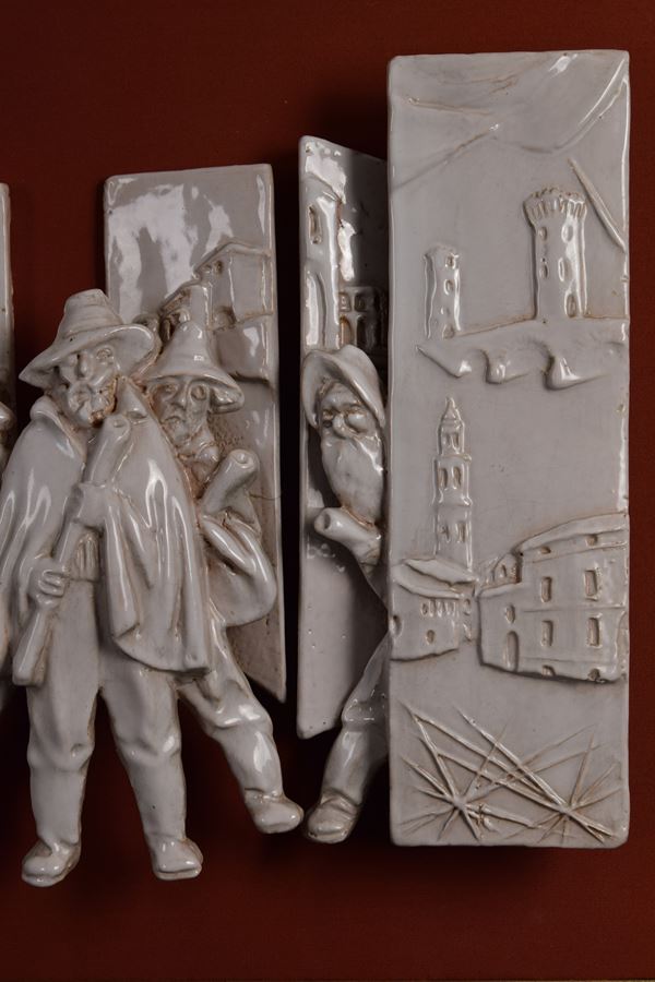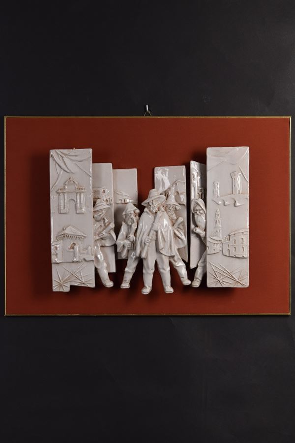 Pannello in ceramica monocroma tridimensionale con al centro il Passatore e la sua banda, ambientato tra i sipari del teatro Masini, decorati con i monumenti più importanti di Faenza.