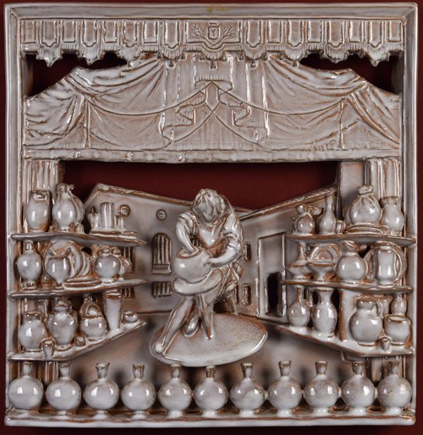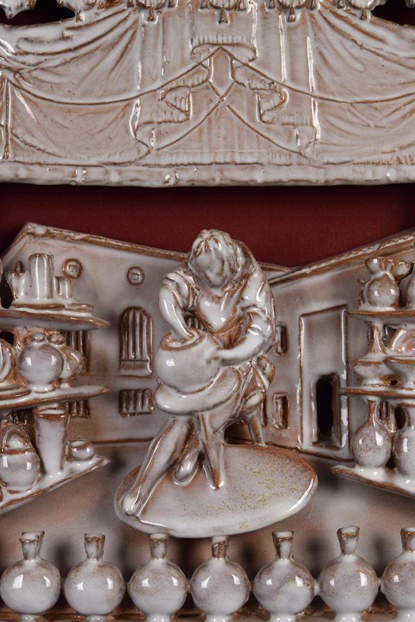 Pannello in ceramica monocroma tridimensionale con torniante in primo piano con alle spalle l'ingresso del MIC, il tutto ambientato sul palco del teatro Masini di Faenza.