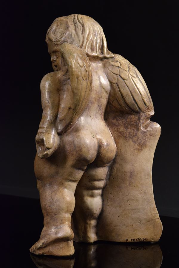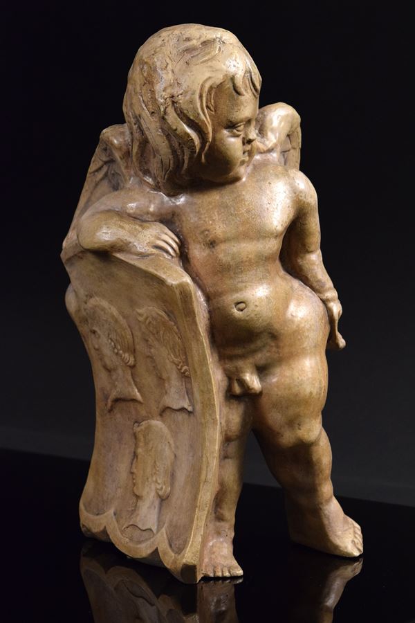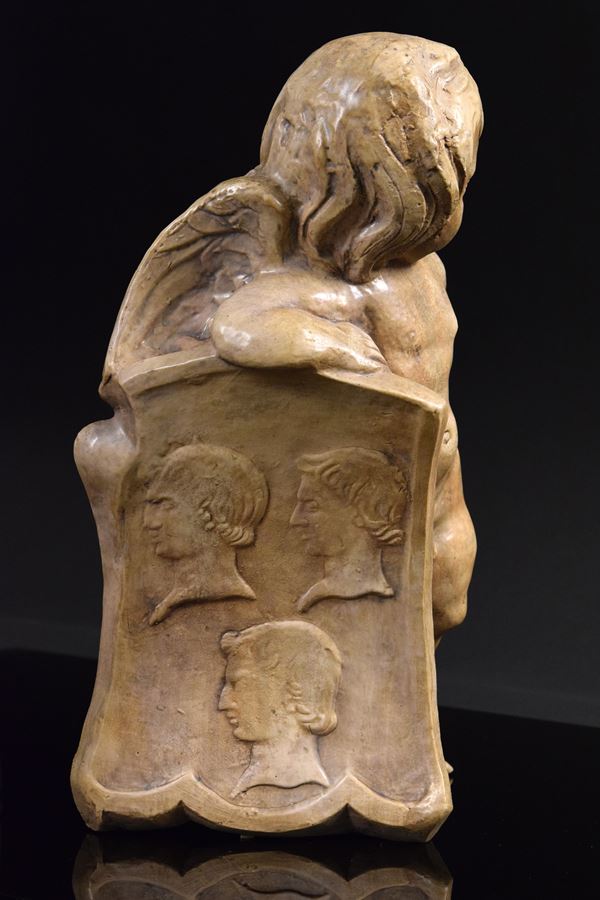 Angelo Bizantino con scudo raffigurante tre teste in ceramica monocroma a tutto tondo.
