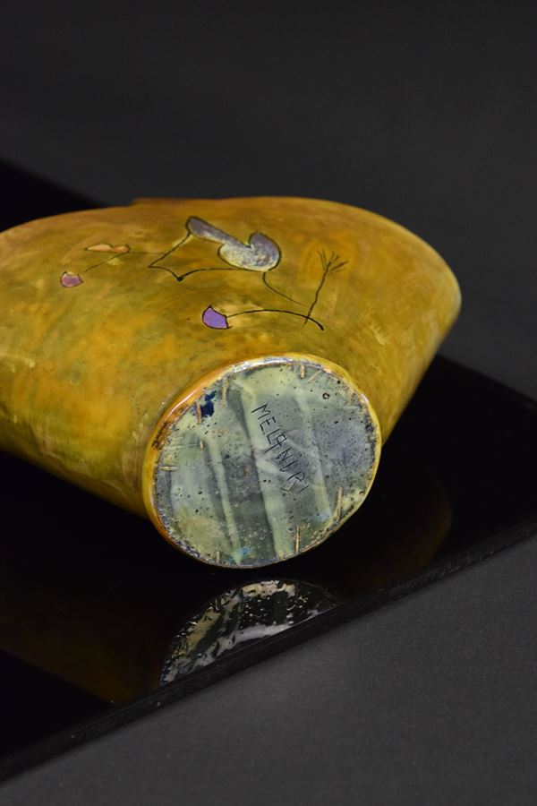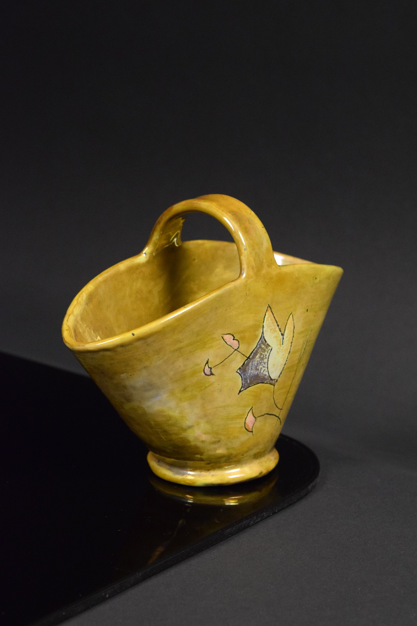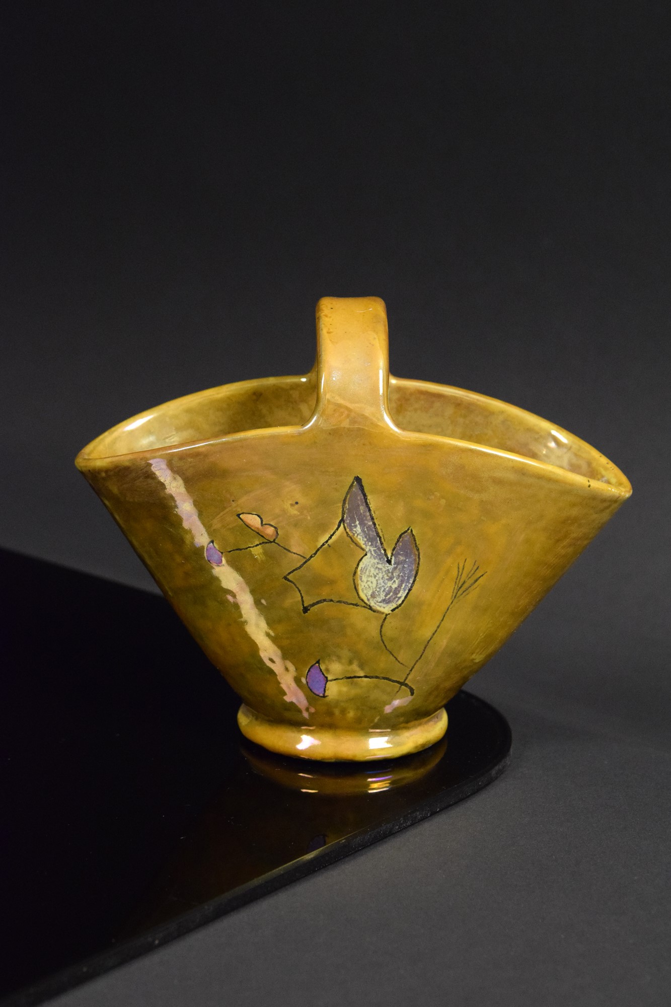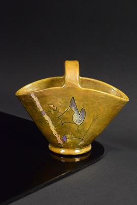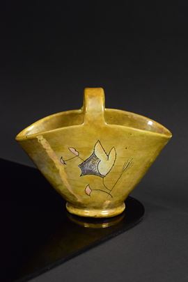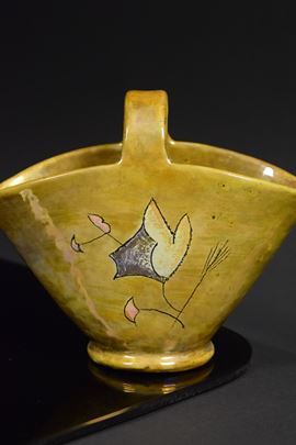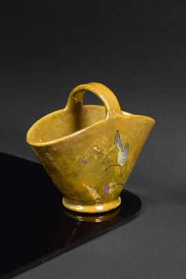 Cestino in ceramica policroma riflessata a lustro con decori vegetali stilizzati.