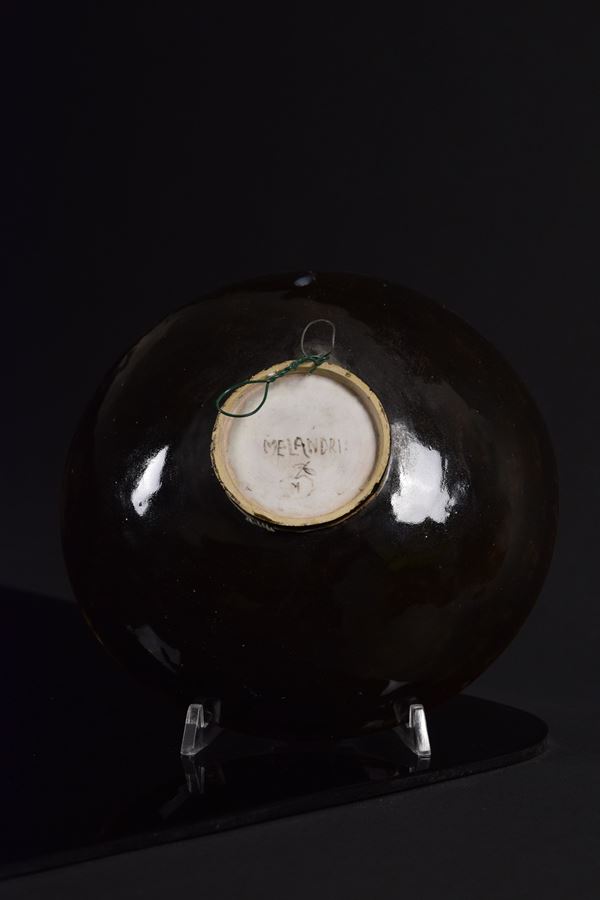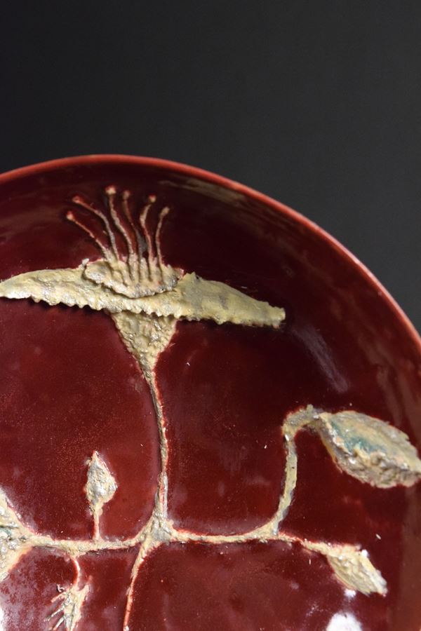 Ciotola in ceramica policroma con decoro vegetale a rilievo stilizzato.
