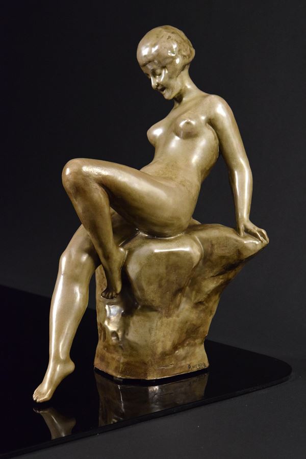 Donna seduta in ceramica monocroma. Da un modello di Enrico Mazzolani.