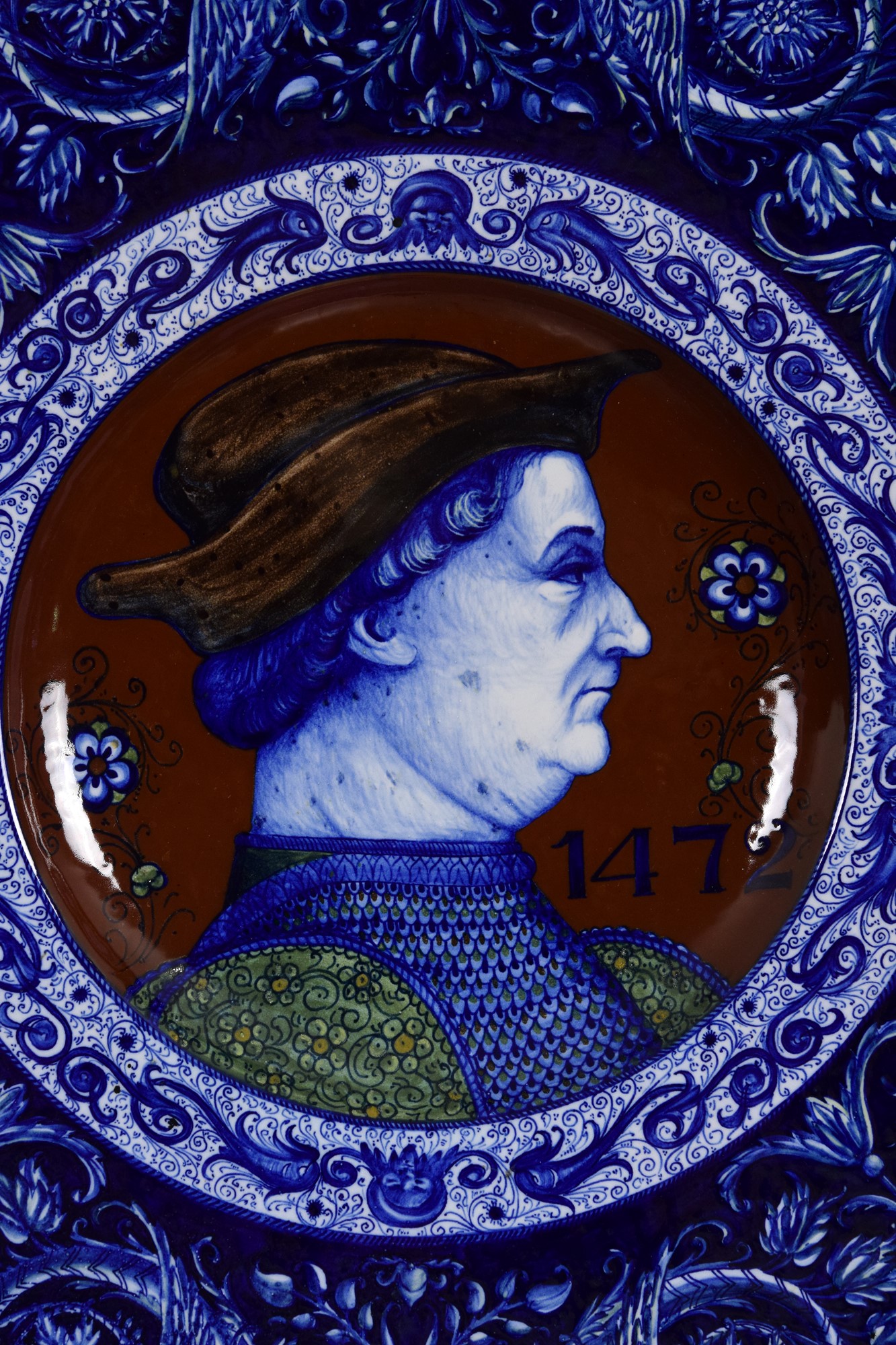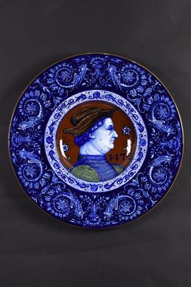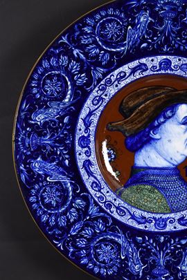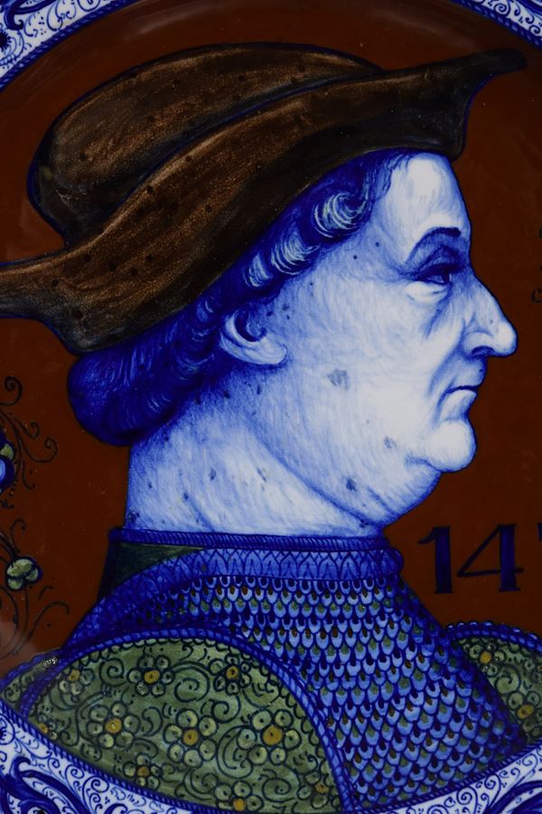 Piatto in ceramica policroma decorato a raffaellesche con ritratto rinascimentale al centro.